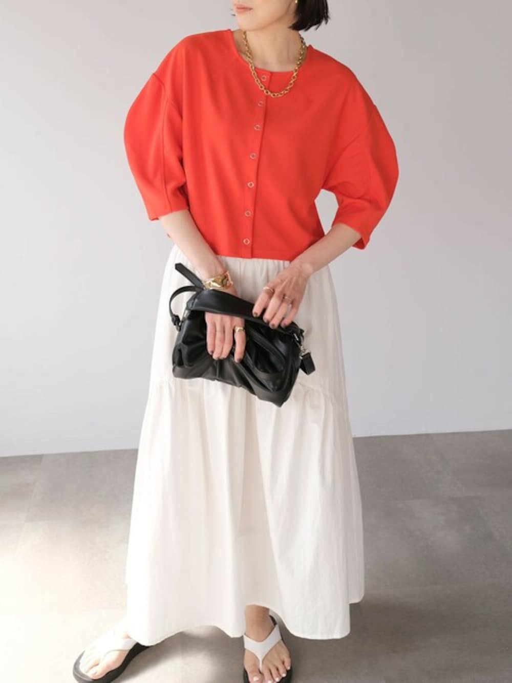 2WAY丸袖ショートカーディガン(td76c05058) 切替ギャザーロングスカート(bt76c05055) Instagram:andj_jp