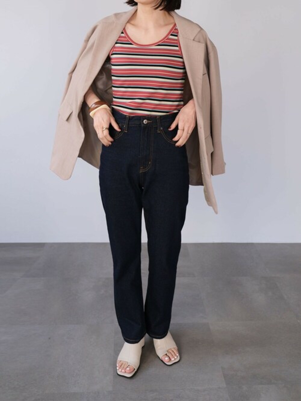 マルチボーダーテレコタンクトップ(tk76x05057) オーバーサイズテーラードジャケット(tj00c04547) 13.5ozハイウエストテーパードデニムパンツ(bg77c05046) Instagram:andj_jp