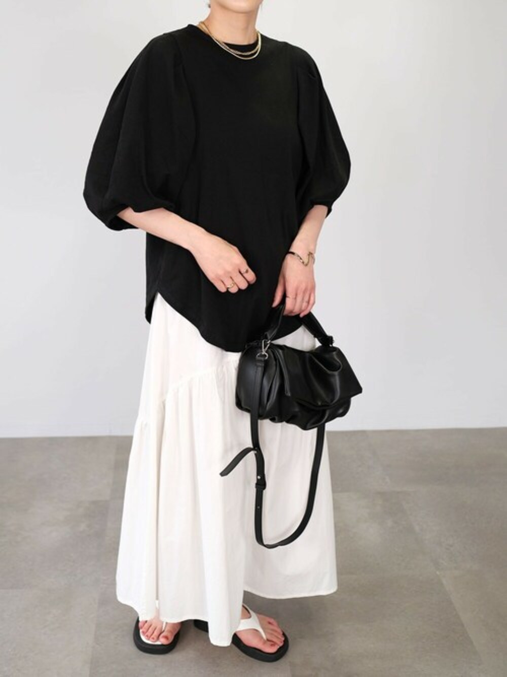 タックボリューム袖Tシャツ(ts76x05060) 切替ギャザーロングスカート(bt76c05055) 2WAYショルダー付餃子バッグ(gz76c05034) Instagram: andj_jp