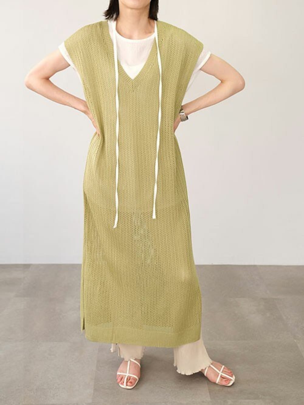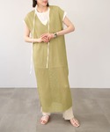 ANDJのワンピース「リネンタッチ透かし編みノースリーブニットベストワンピース」を使ったコーディネート