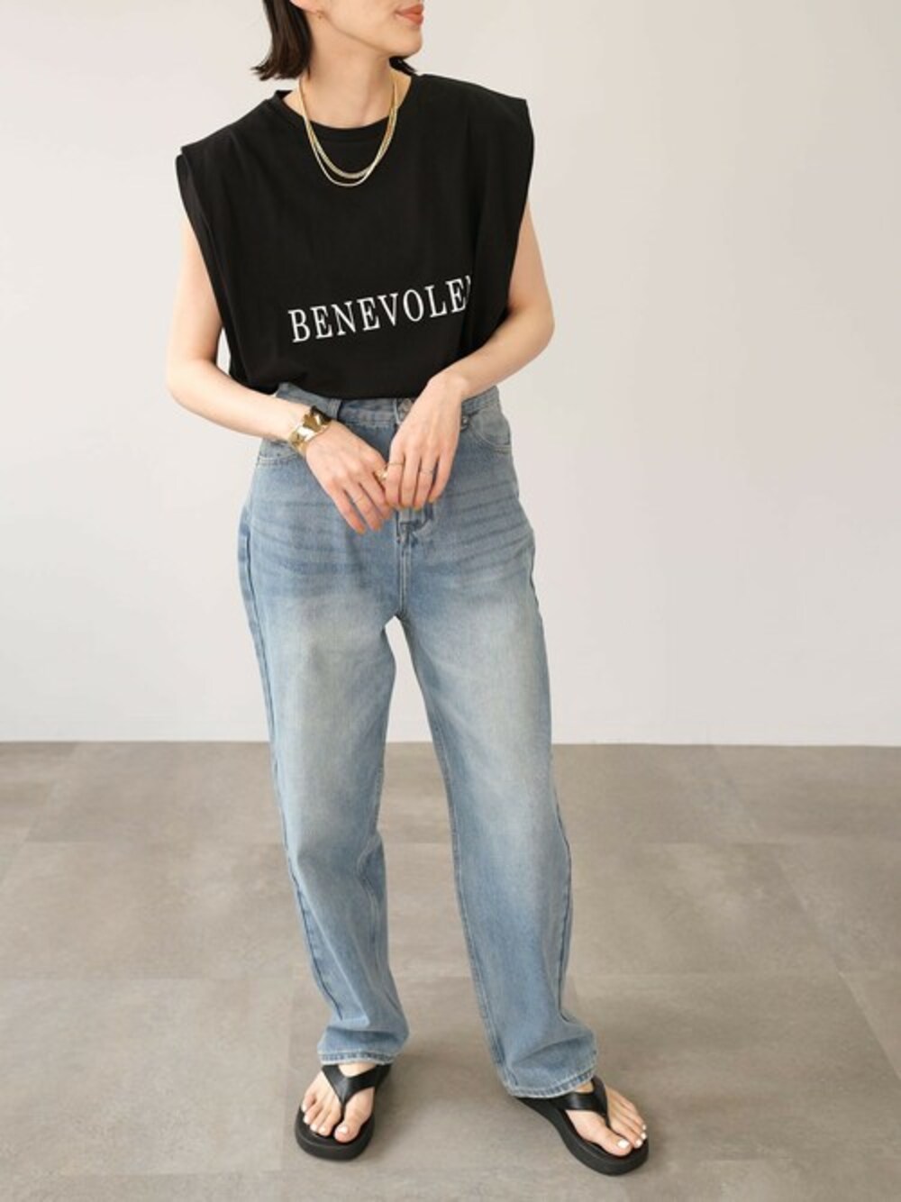 ロゴプリント袖タックゆるトップス(tk76x05056) 13.5ozハイウエストテーパードデニムパンツ(bg77c05046) Instagram: andj_jp