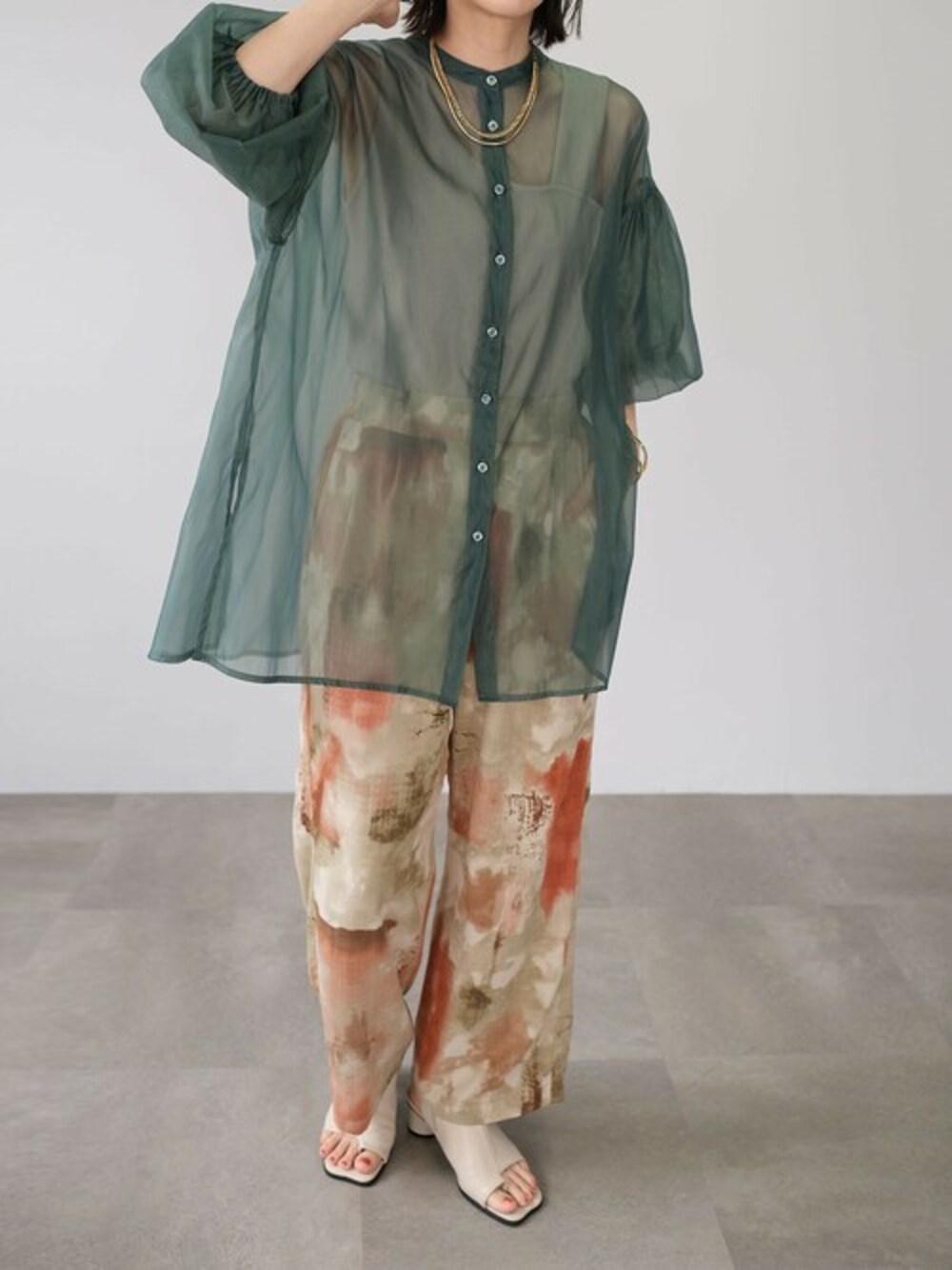 オーガンジーボリューム袖ギャザーブラウス(tb77x05075) ニュアンス柄ストレートイージーパンツ(bf77x05074) Instagram: andj_jp
