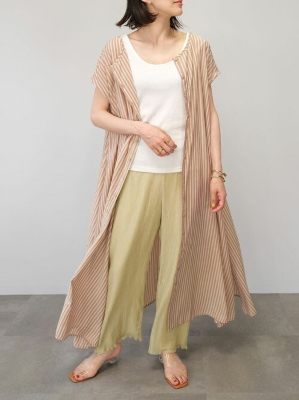 ANDJのシャツワンピース「2WAY先染めストライプフレアワンピース」を使ったコーディネート