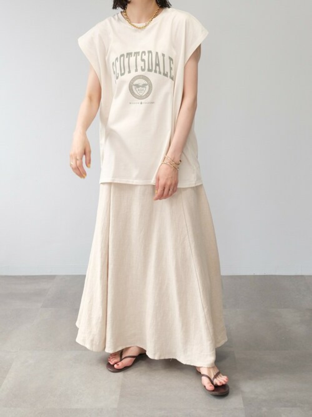 カレッジプリントフレンチスリーブTシャツ(ts76x04915) リネンロングドレープスカート(bt73c04085) Instagram : andj_jp