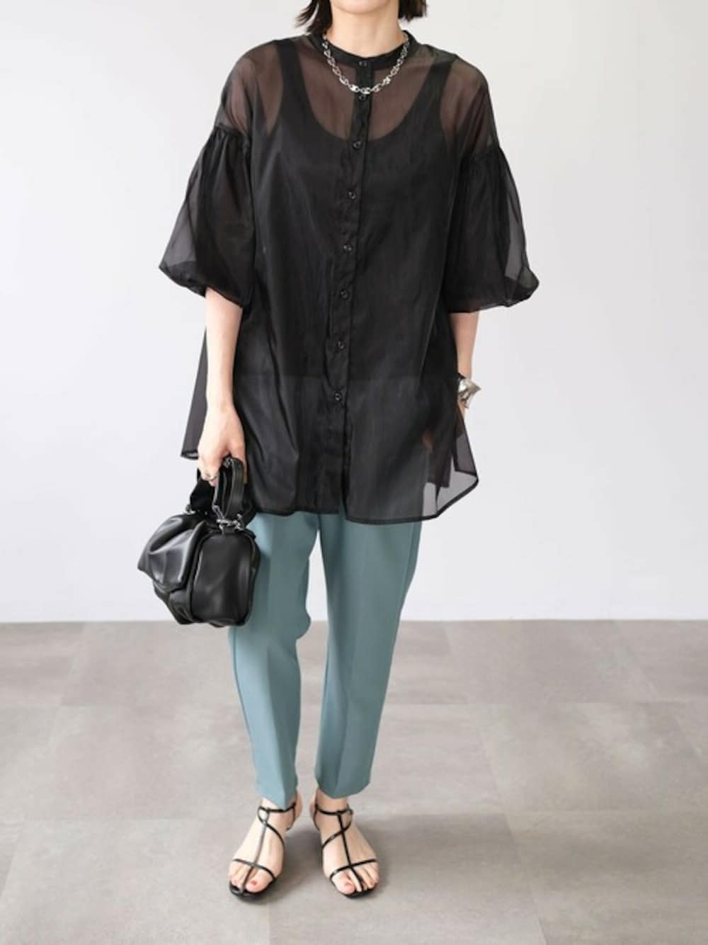 オーガンジーボリューム袖ギャザーブラウス(tb77x05075) タック入りイージーテーパードパンツ(bz75q04420) 2WAYショルダー付餃子バッグ(gz76c05034) Instagram : andj_jp