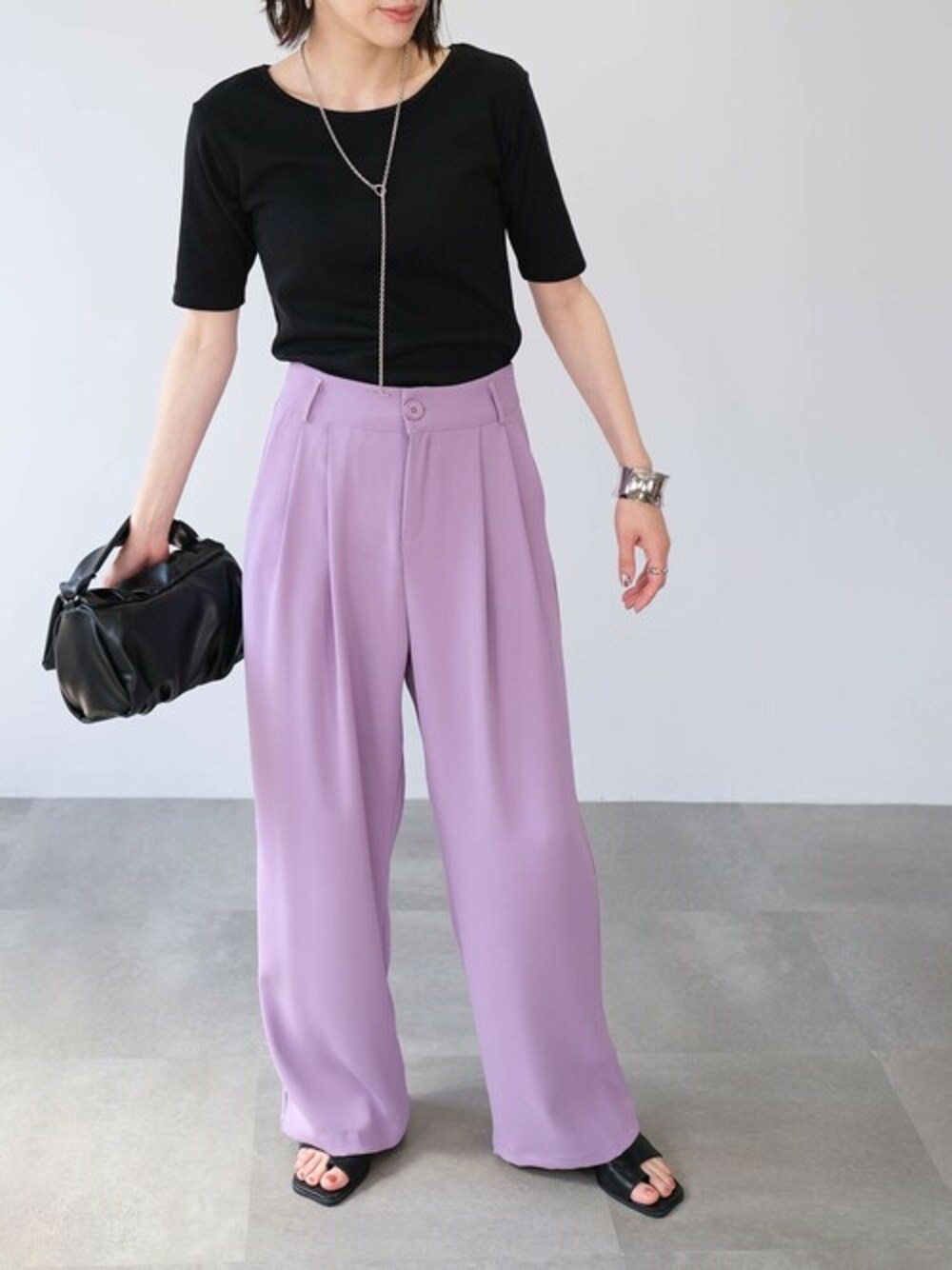 2WAYバックオープンリブトップス(ts78x05081) ハイウェストダブルタックセミワイドスラックスパンツ(bf09q05012) 2WAYショルダー付餃子バッグ(gz76c05034) Instagram : andj_jp