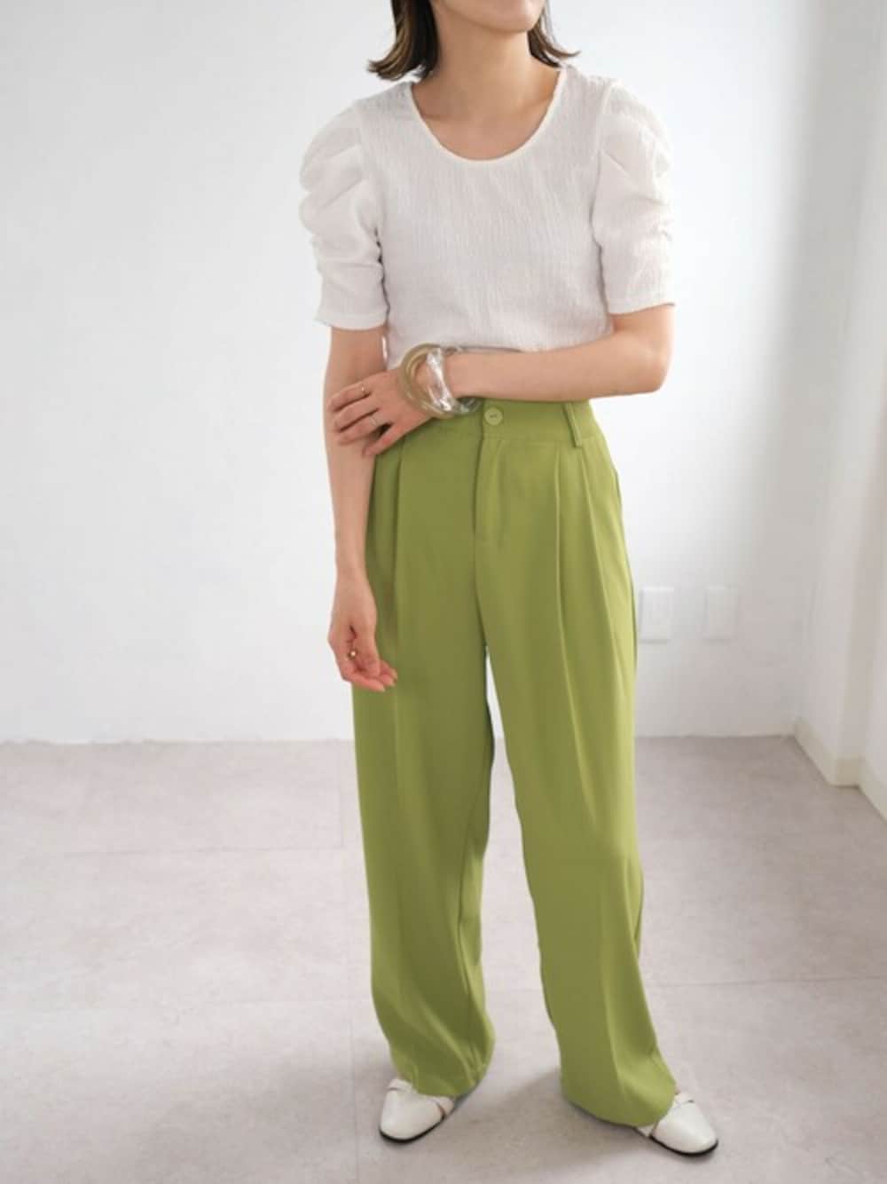 パワーショルダーワッシャー加工ラウンドネックトップス(ts78x04956) ハイウェストダブルタックセミワイドスラックスパンツ(bf09q05012) Instagram : andj_jp