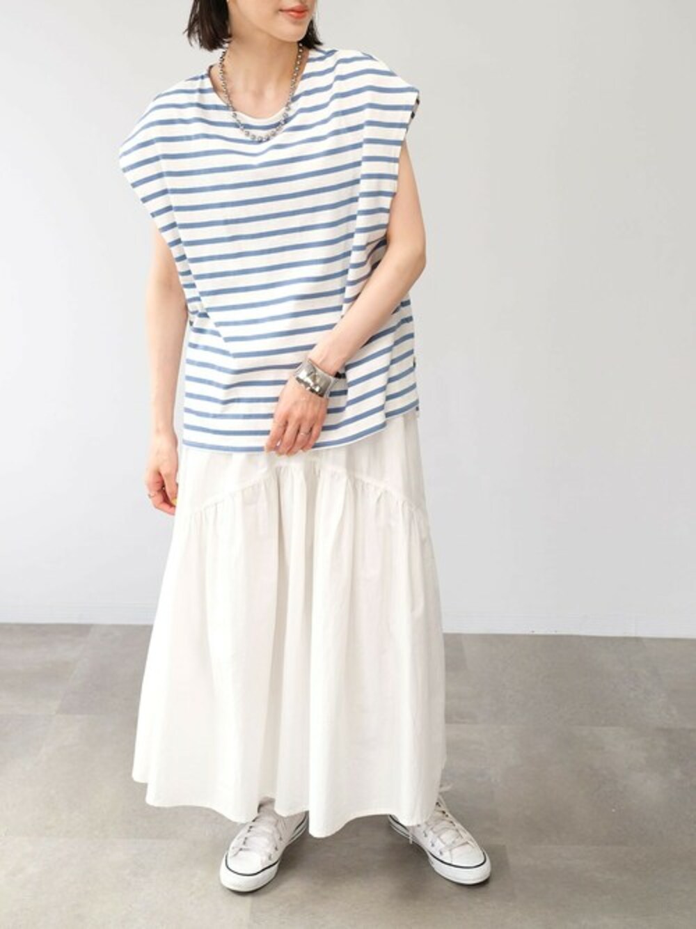 バックロゴタグボーダーTシャツ(ts76x04988) 切替ギャザーロングスカート(bt76c05055) Instagram : andj_jp