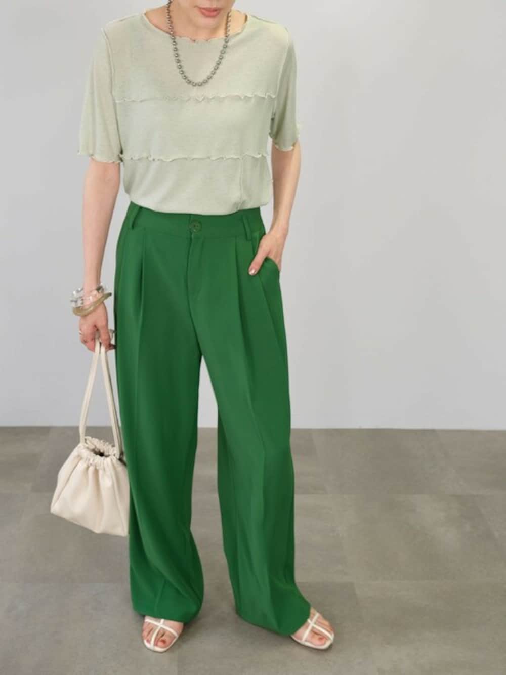 メロウシアーリブトップス(ts76x04609) ハイウェストダブルタックセミワイドスラックスパンツ(bf09q05012) Instagram : andj_jp