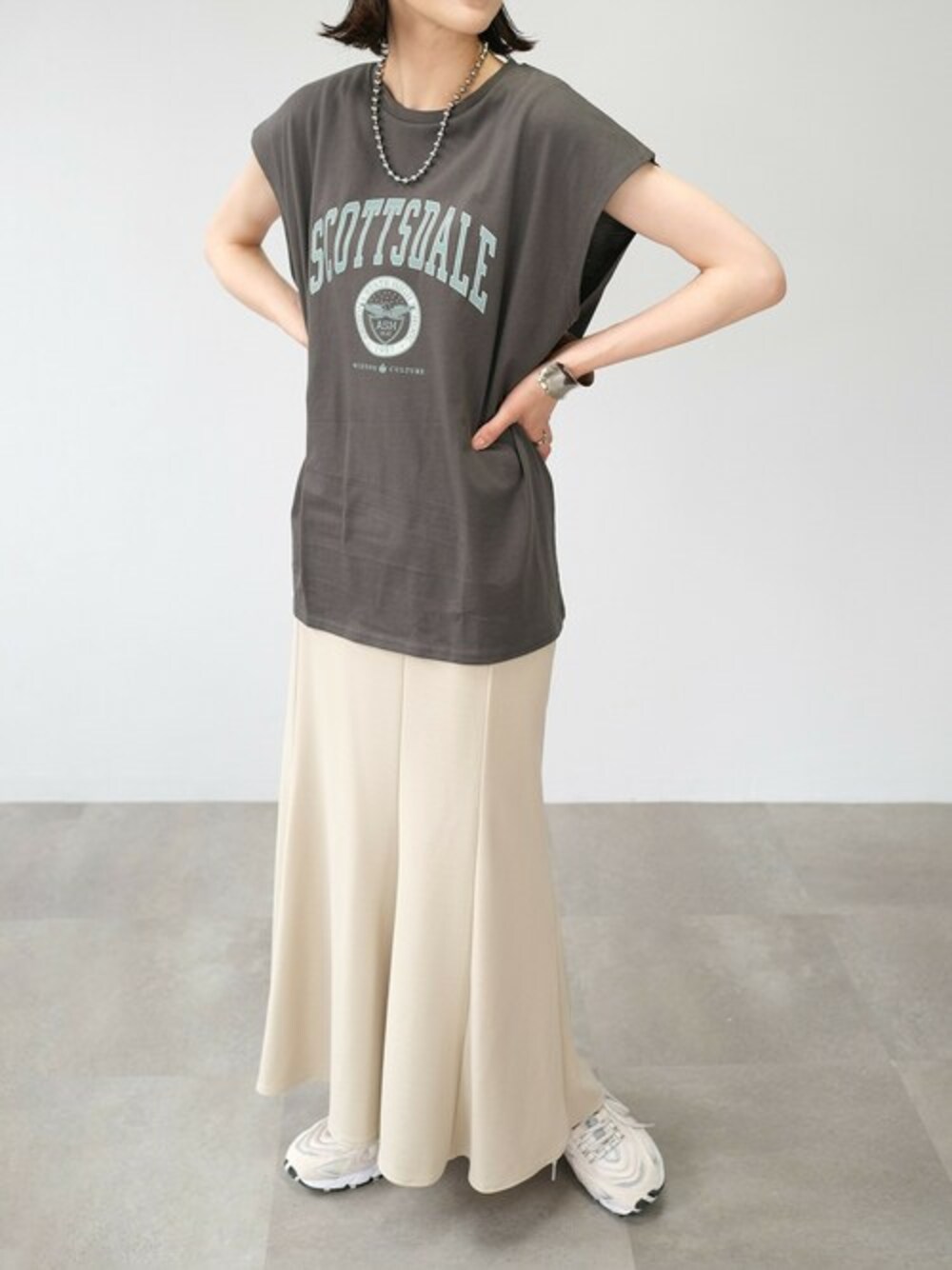 カレッジプリントフレンチスリーブTシャツ(ts76x04915) ジョーゼットマーメイドスカート(bt75c05039) Instagram : andj_jp