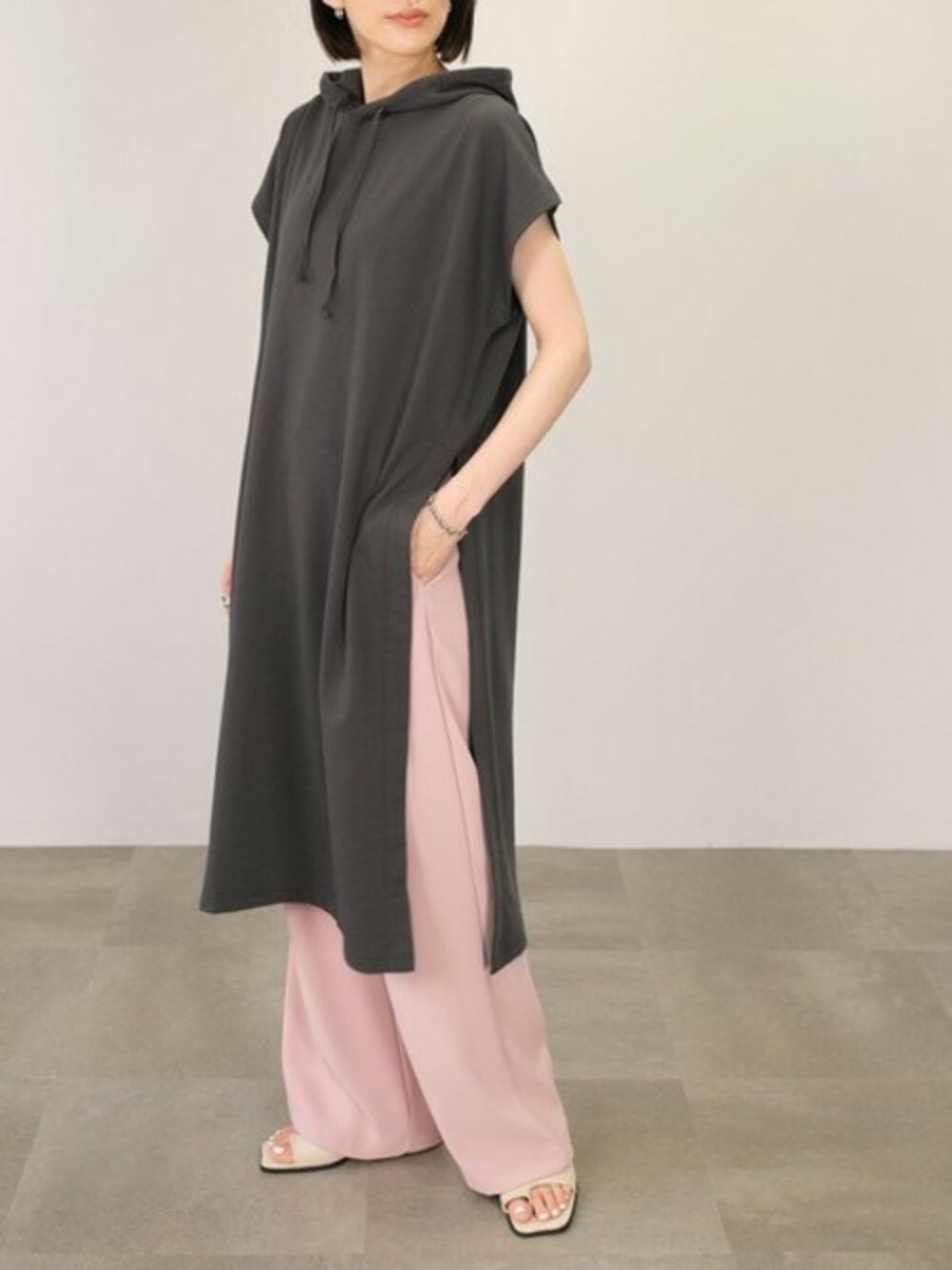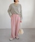 裏毛フーディーロングベスト(tv77q04707) ハイウェストダブルタックセミワイドスラックスパンツ(bf09q05012) Instagram : andj_jp