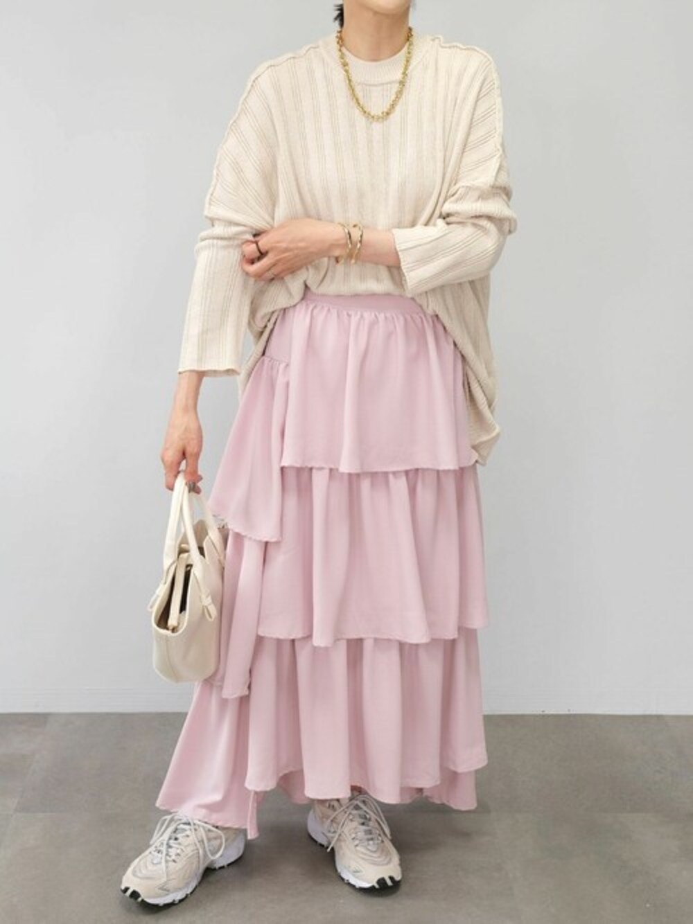 トロピカルステップティアードスカート(bt77q05086) 2WAYスリットワイドリブニット(tn76c04522) Instagram : andj_jp