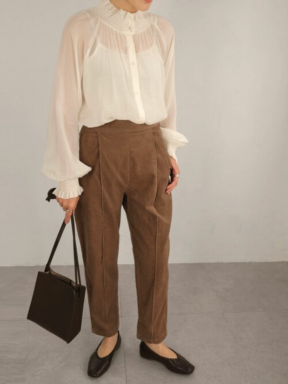 【ANDJ MADE】【2022/AW】襟シャーリングフリルスタンドカラーシアーブラウス(tb77c05030) センターシームラインコーデュロイテーパードパンツ(bs77d04828) Instagram : andj_jp