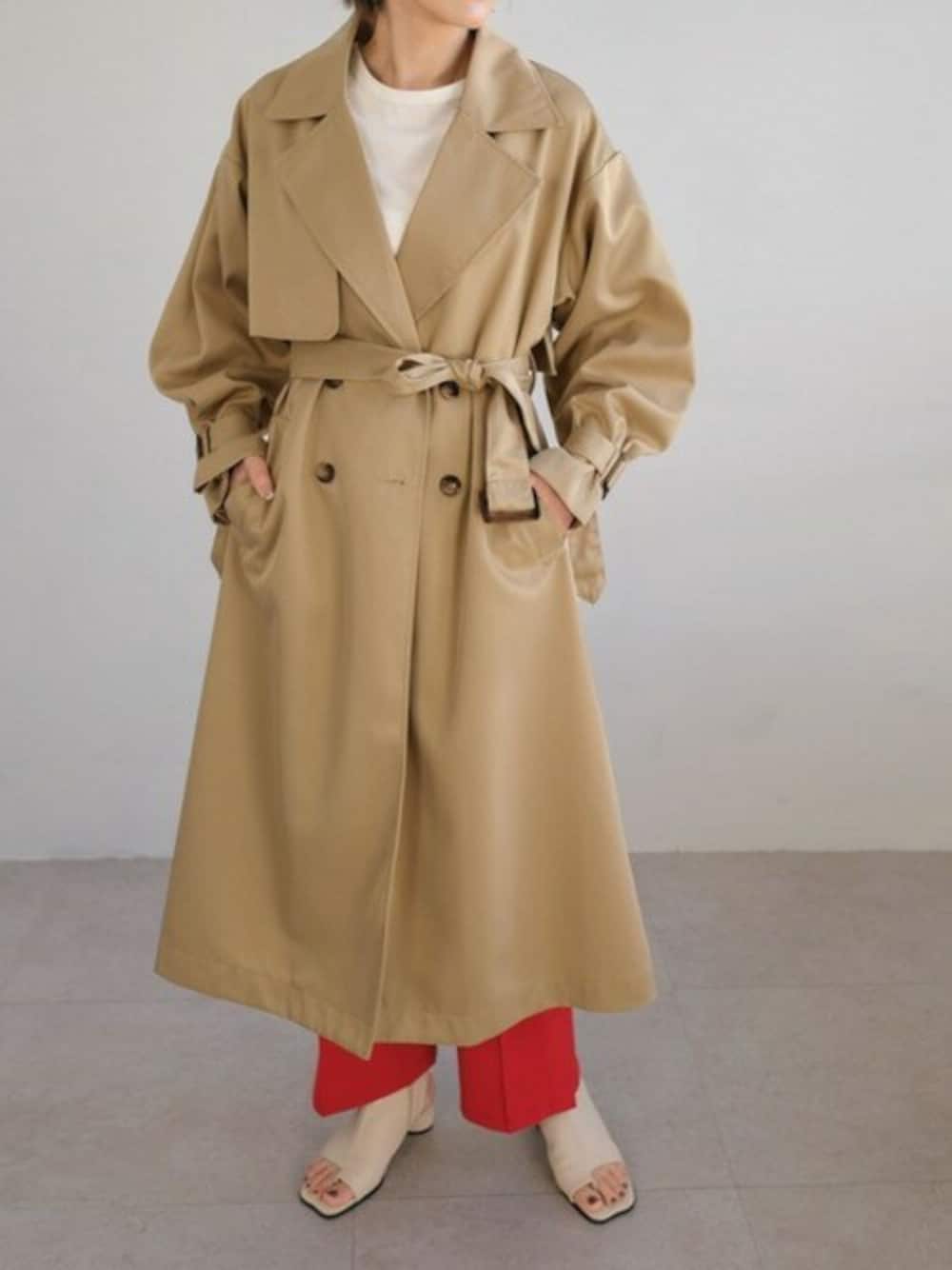 高密度ツイルボリューム袖トレンチコート(to80c05043) 【ANDJ MADE】ジョーゼットセンタープレスセミフレアパンツ(bf80c04857) Instagram : andj_jp