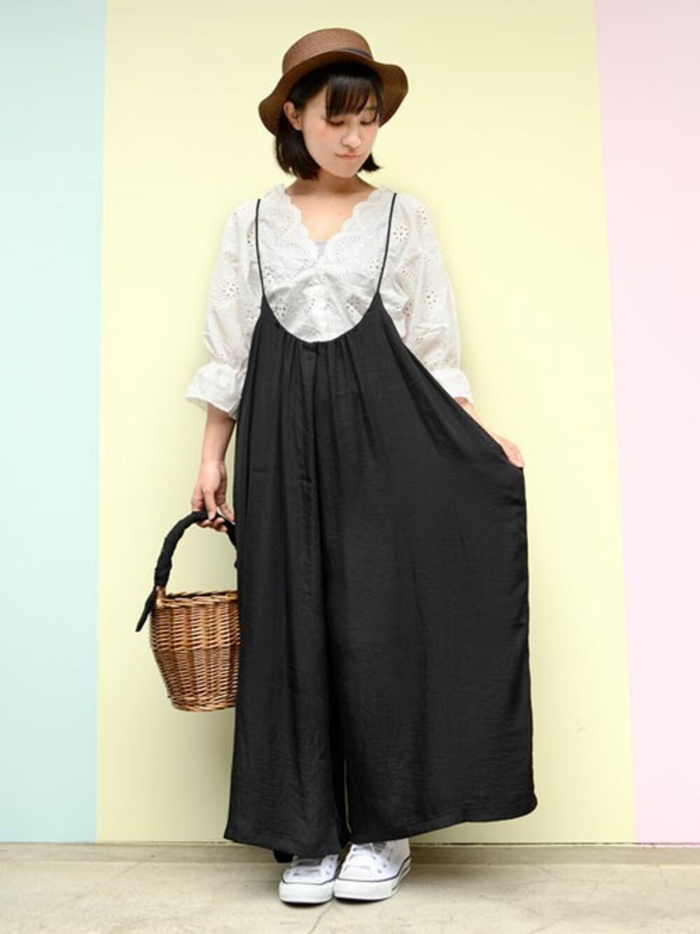 ちひろのつなぎ/オールインワン「ヴィンテージサテンギャザーサロペットワイドパンツ」を使ったコーディネート