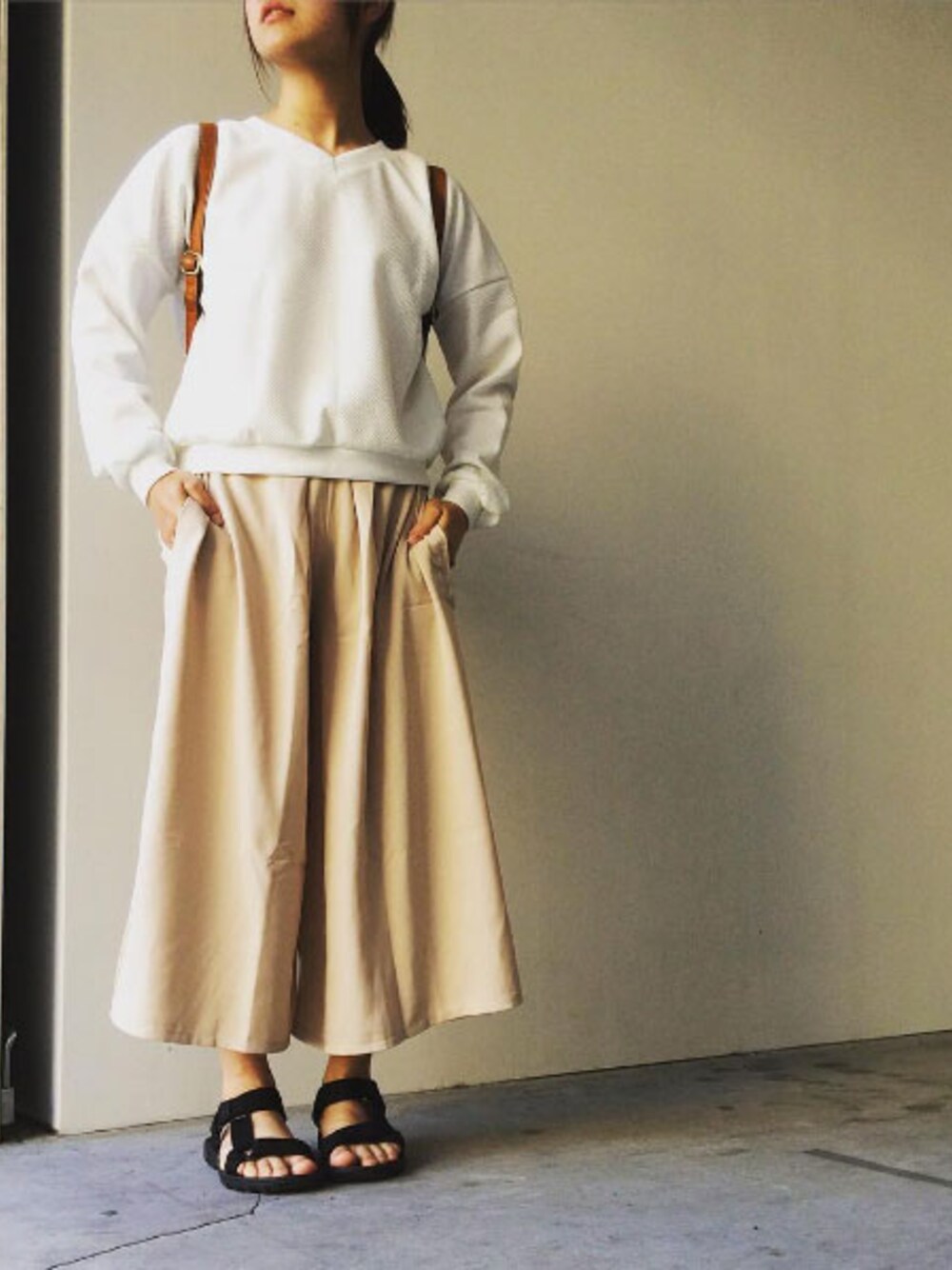 Vネックのトレーナーにベージュのガウチョ。 カジュアルだけどやさしいカラーとVネックで女性らしさをプラス。