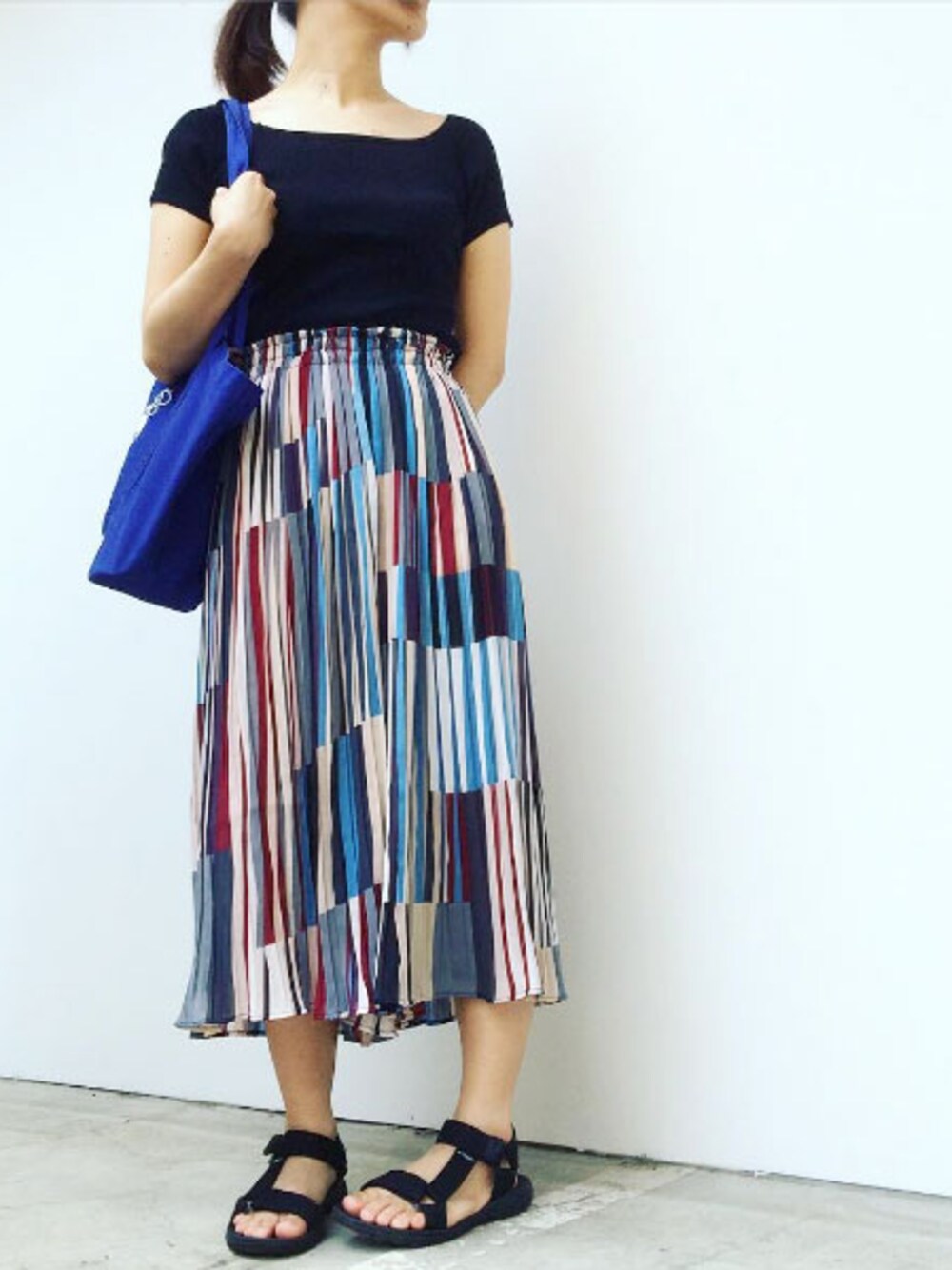 スカートに見えますが、ガウチョです👀! プリーツ加工されたシフォン生地が軽やかで涼しい。 カラフルだけど派手じゃない柄が気に入ってます* トップスはサマーニット。オフショルにもできる2WAY!