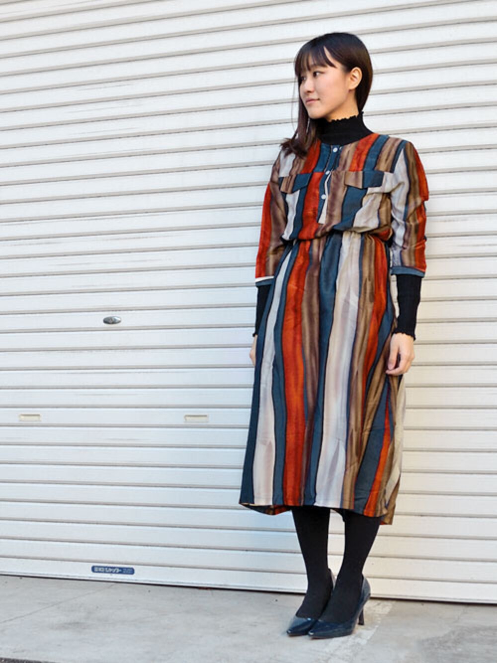 大人気のレトロストライプワンピースが 再入荷してます! ツルッとしたやや光沢のある生地が お上品な雰囲気 💄✨ インナーにはフリルネックニットを。 このニットの、もっちりした着心地に やみつき❤️!シンプルなので 着回しにとても使える👌!