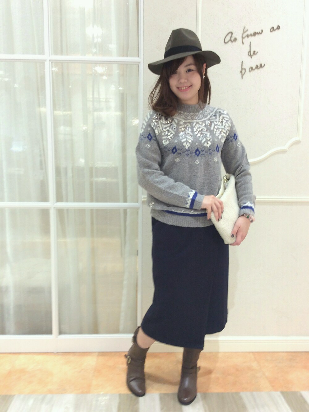 *゜。*゜。*゜。*゜。*゜。*゜。*゜。* 久しぶりの 友達とのデート♡ ちょっと頑張りたいけど 力入れすぎとも思われたくない… 今年流行のハットを取り入れ 旬のグレーニットをメインにした 大人女子 秋コーデ* ニットはキラキラビジュー入り.+'゜ 胸元が キラキラ光って 自分が輝いてるみたい… ◇◆◆◆◆◆◆◆◆◆◆◆◆◇ イベントのお知らせです! 《2015年11月7日(土)~13日(金)》 博多アミュプラザ店では アズノゥアズポイントカード ★Wポイント★プレゼント! 15,000円(+税)以上で ダブルポイント☆ アウター・コートお買い上げで、 ダブルポイント +2ポイントプレゼント☆☆ ◇◆◆◆◆◆◆◆◆◆◆◆◆◇ 是非この期間にアウターゲットして お得にポイント貯めてください(^o^)/ 心よりお待ちしております。 *゜。*゜。*゜。*゜。*゜。*゜。*゜。*