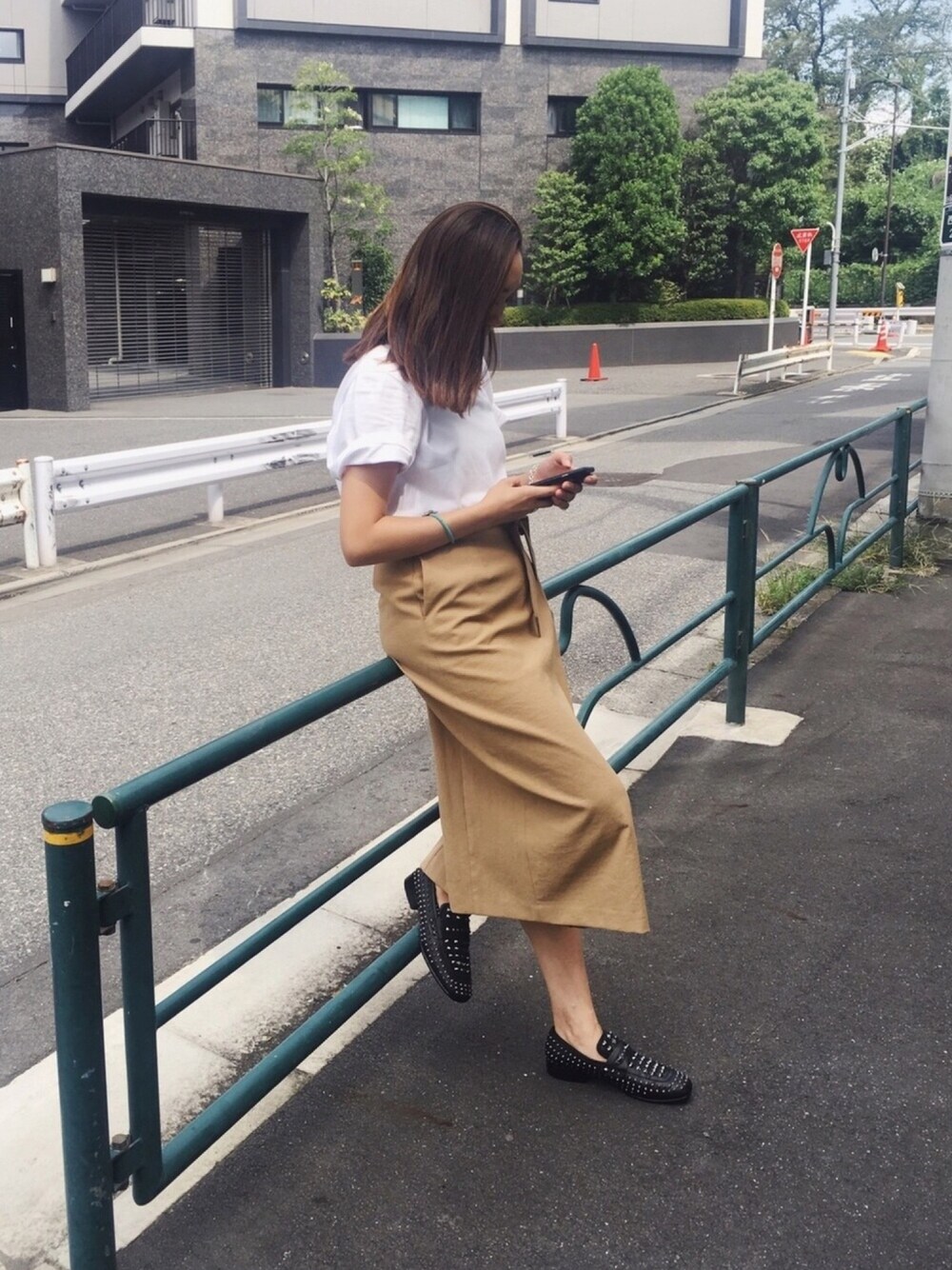 まだまだ日中は暑いですが、足元だけでも秋物のローファーを。パンツスタイルはもちろん、こんな風にスカートに合わせても◯ 全面に施されたスタッズが、シンプルなコーディネートにエッジを効かせてくれます!
