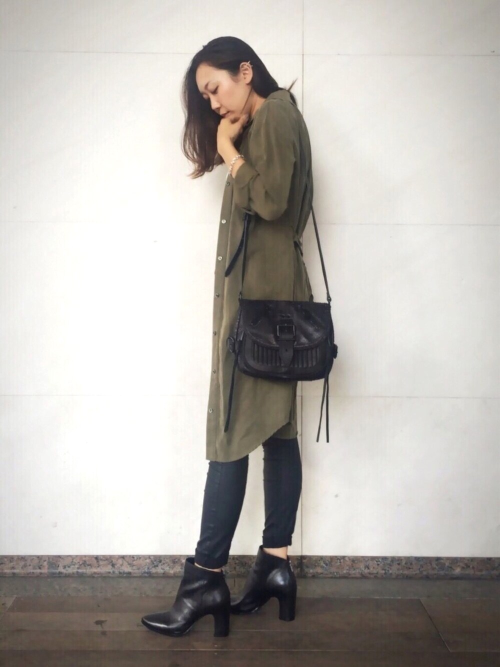トレンドのロングシャツにはヒールとショルダーバッグで、縦長効果をさらにUP! 今年のショートブーツは、くるぶしよりちょっと長めの丈が旬です♪ ★10/1(木)ASHがZOZOTOWNにOPEN!!
