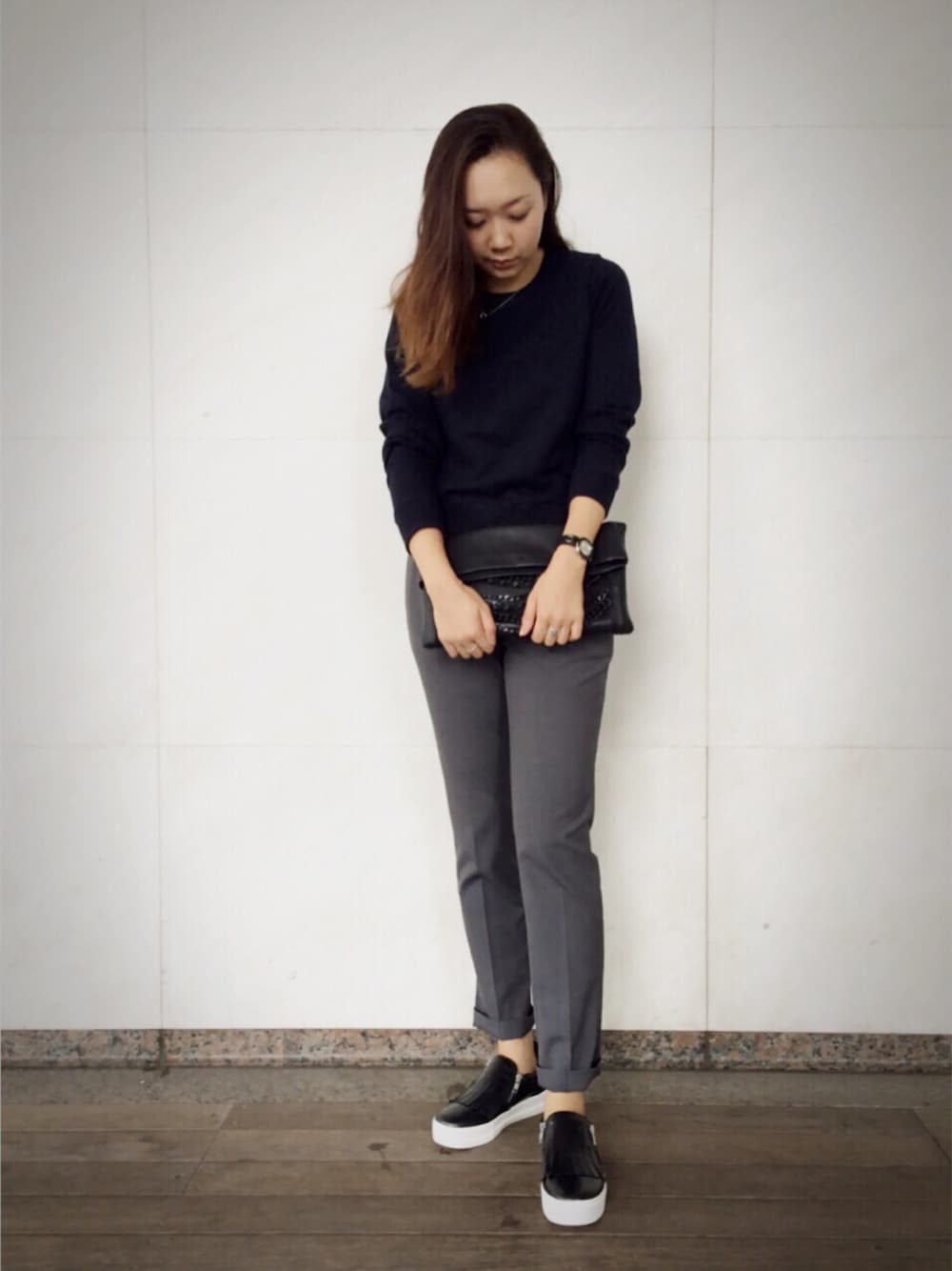 カッチリとした印象のトラウザーパンツに、あえてカジュアルなアイテムを。ローファーデザインのスリッポンで、きちんと感も残しつつ★ オールブラックのチェーンがかっこいいクラッチバッグは、シーンを選ばず使えます!
