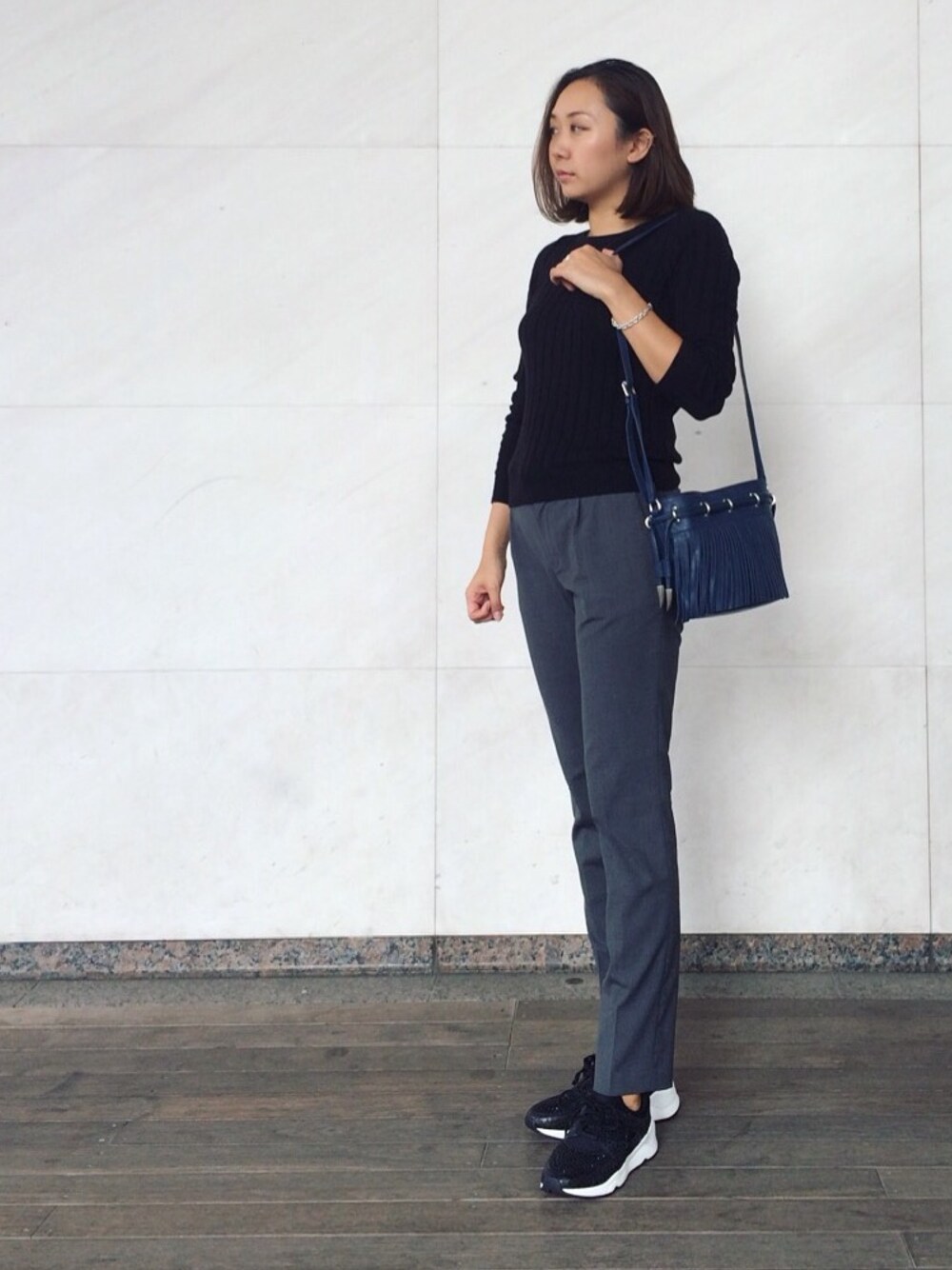 カッチリ目のテーパードにレースアップシューズはいかにもなので、ハズしでスニーカー〈MOOD〉を。 これにリュックを合わせるとまたそれもいかにもなので、小さめのショルダー〈ALLEGRA〉を。 バッグは抜け感のあるネイビーがオシャレです♪