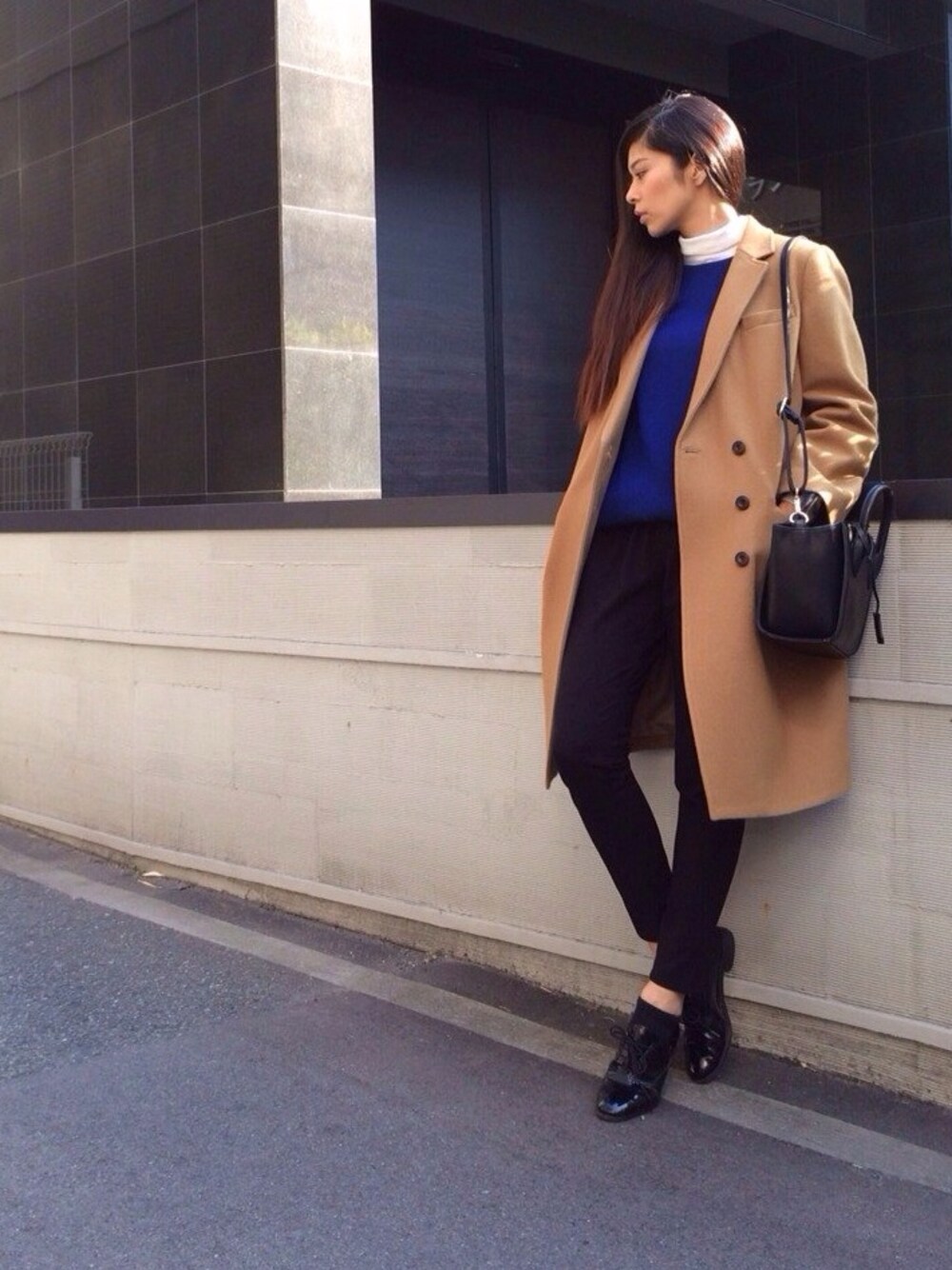お気に入りのロングチェスターコートを使った マニッシュスタイル。 インナーに使ったロイヤルブルーがポイント! CAM×BLUはすきなカラーバランス♪