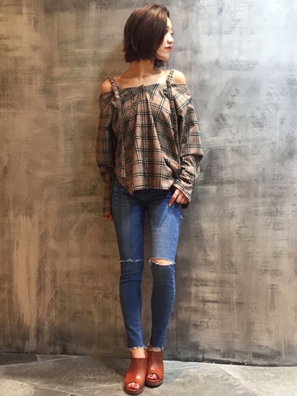 チェック柄のショルダーオープンシャツは スキニーと合わせて秋らしく♪