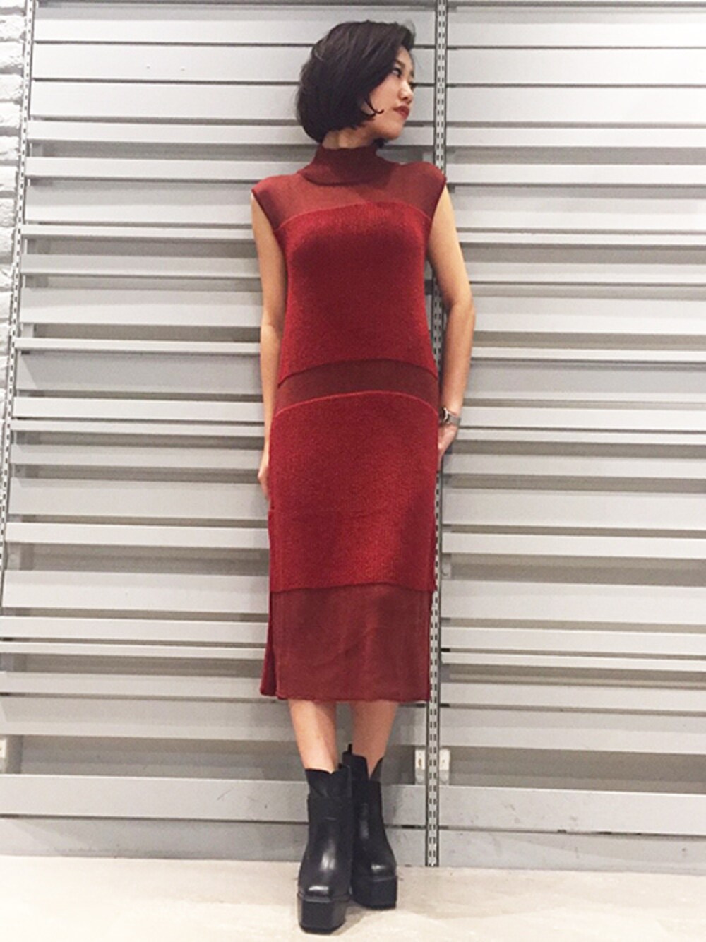 真っ赤なハイネックロングワンピに ゴアブーツを合わせてカジュアルさも♪