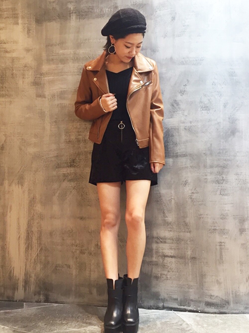 リブニットにベロアのショーパンをはいて ベージュのライダースできつくなり過ぎず♪