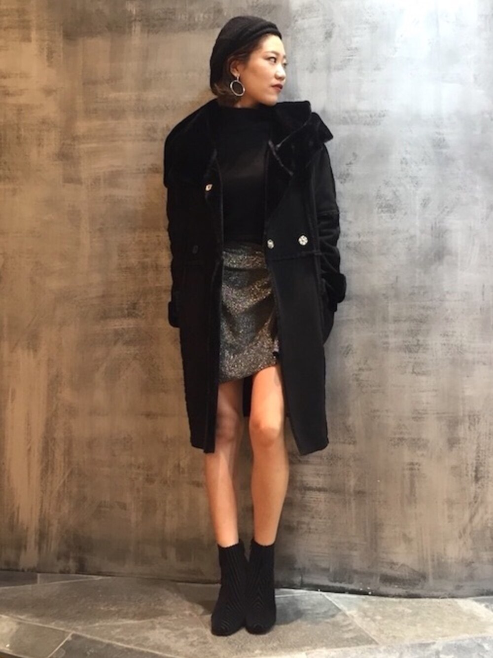 ベーシックなニットロンTにミニスカート 羽織はロングムートンで女らしく♬