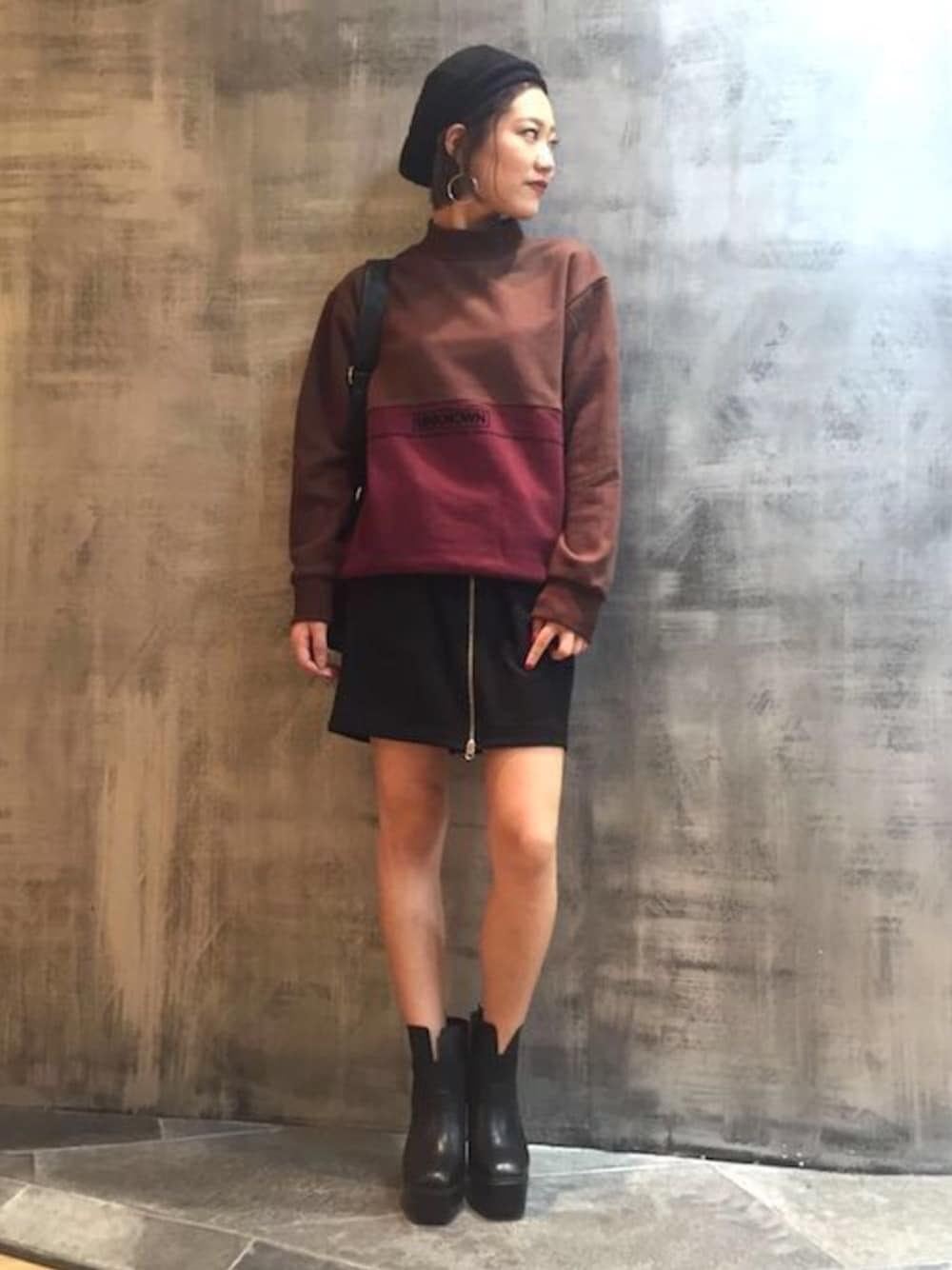 ボルドーのトレーナーに フロントのジップがポイントのスカートでモードコーデ♬