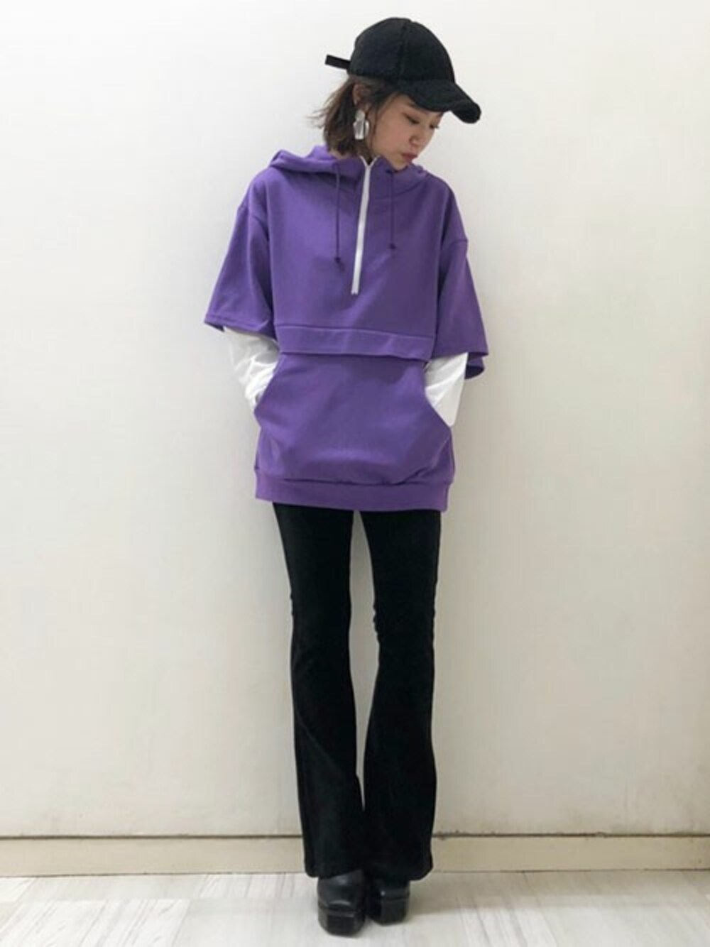 スポーティな印象のパーカーもベロアのパンツで大人のカジュアルスタイリング。