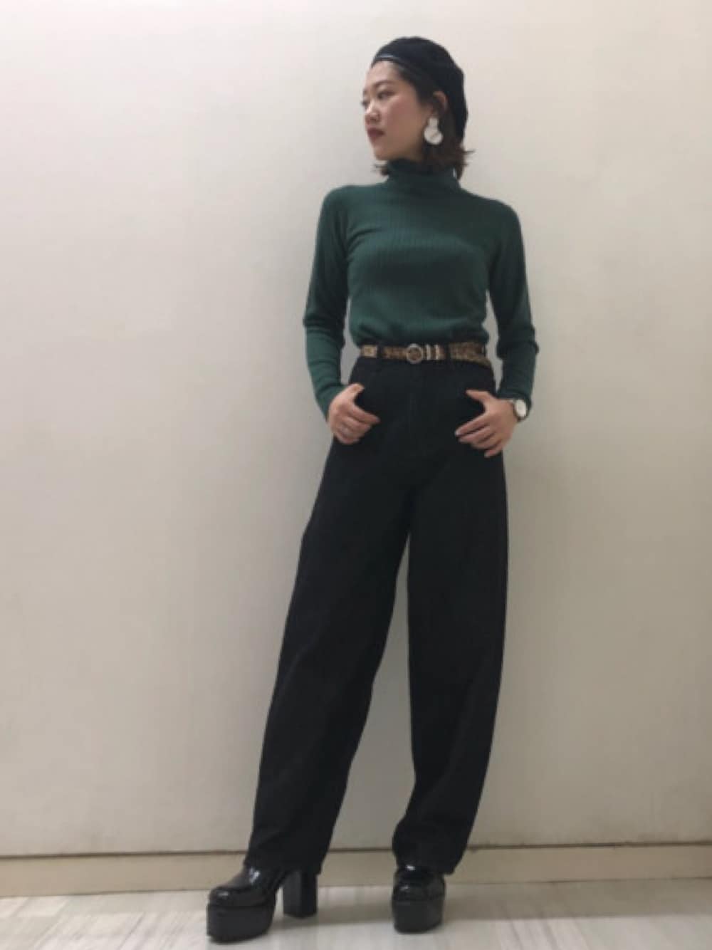 定番で着回しのきくハイネックはGRNで差し色に。 ブラックアイテム合わせならクールに。