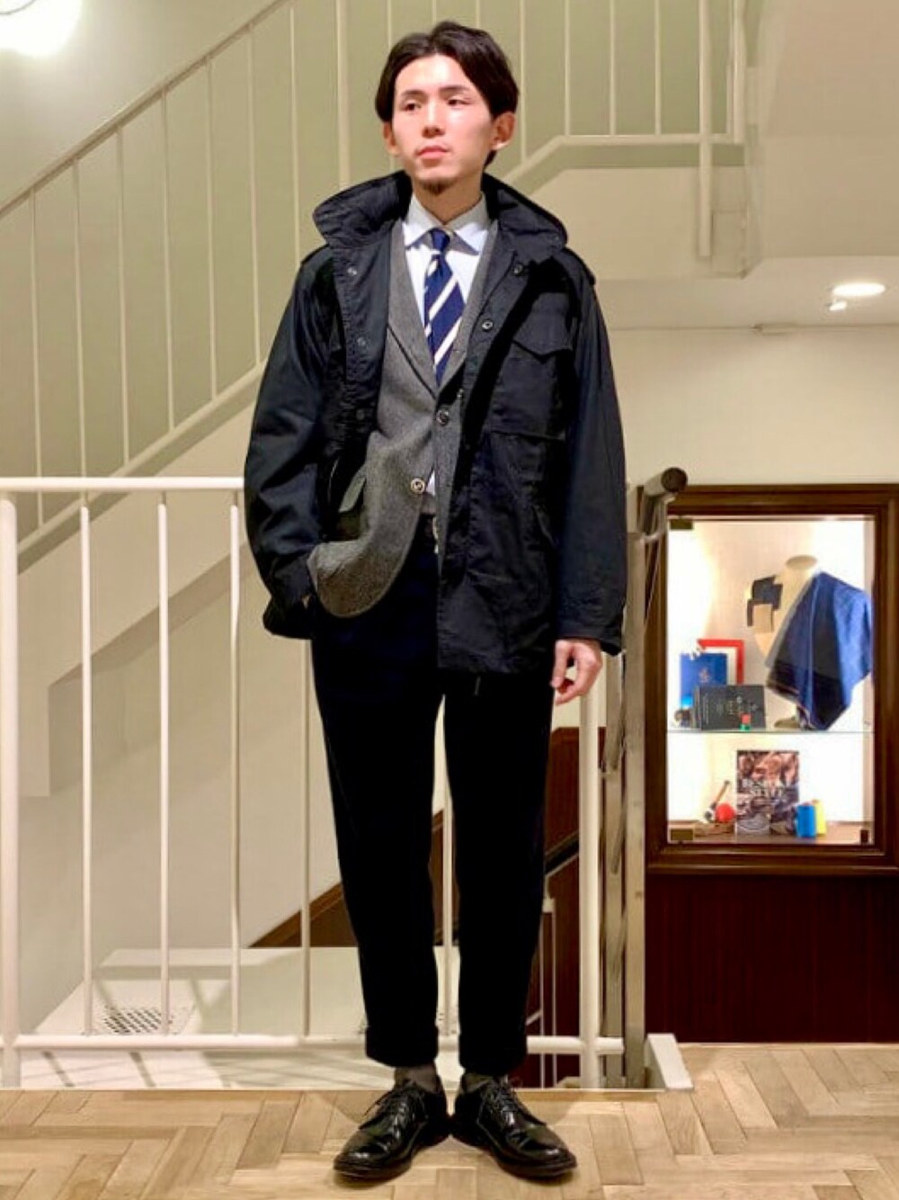 ジャケットの上からミリタリーブルゾンをレイヤード。 この手のブルゾンはポケットに物をパンパンに詰めて着たいです。