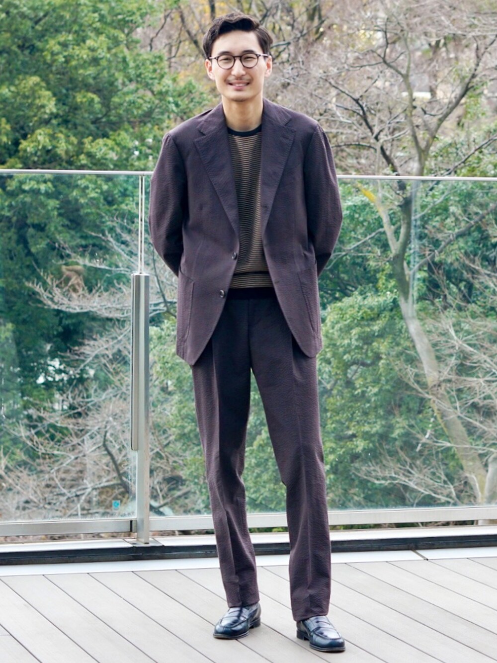 セットアップ感覚でラフに着こなしたスーツスタイルです。 インナーに合わせた<Letroyes>のクルーネックニットがポイントです。 細いピッチのボーダーがさり気ないアクセントになります。