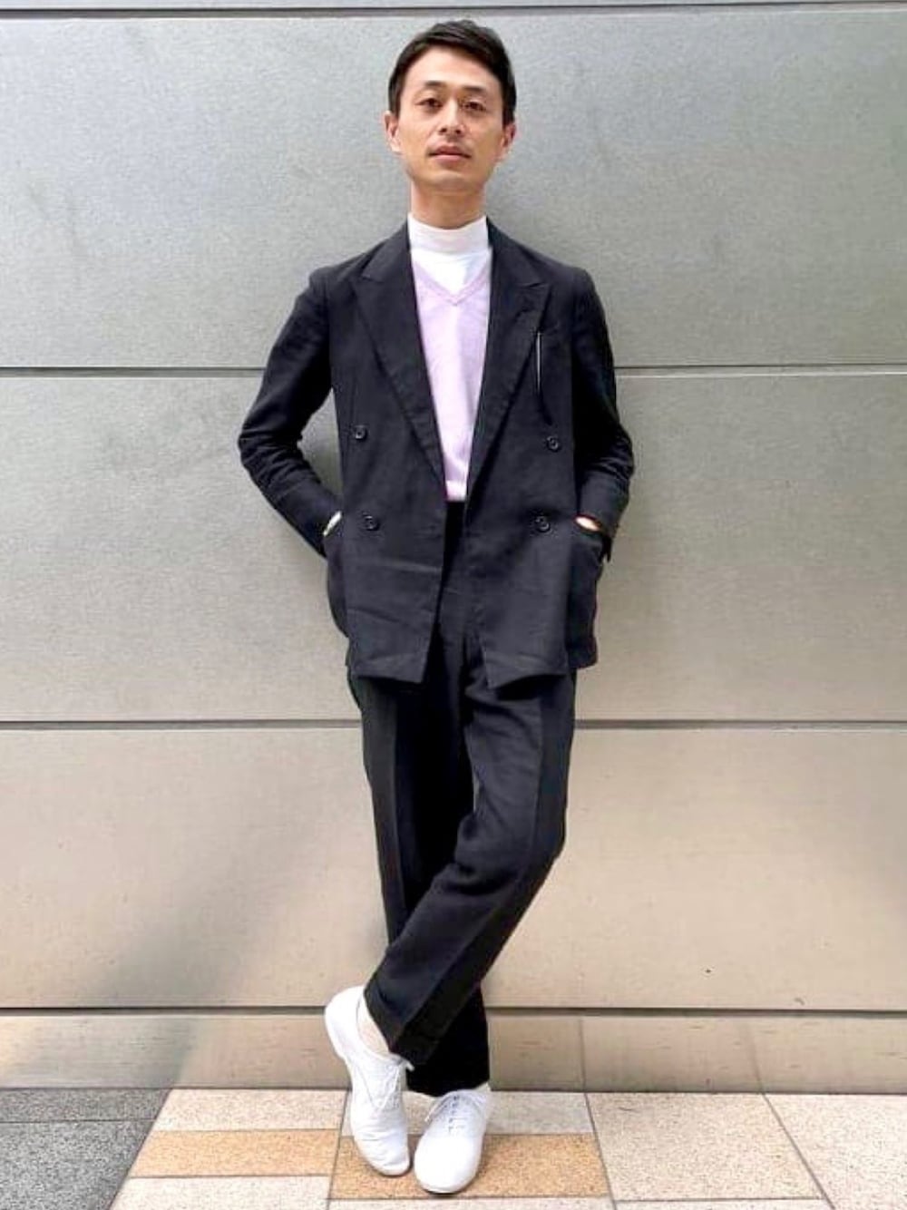 <CROWN>のダンスシューズをブラックリネンスーツに合わせました。 VゾーンはモックネックTシャツにコットンのハイゲージニットでモダンなスタイルを狙ってます。 モックネックTシャツとVネックの組み合わせは普段しないので新鮮に感じました。