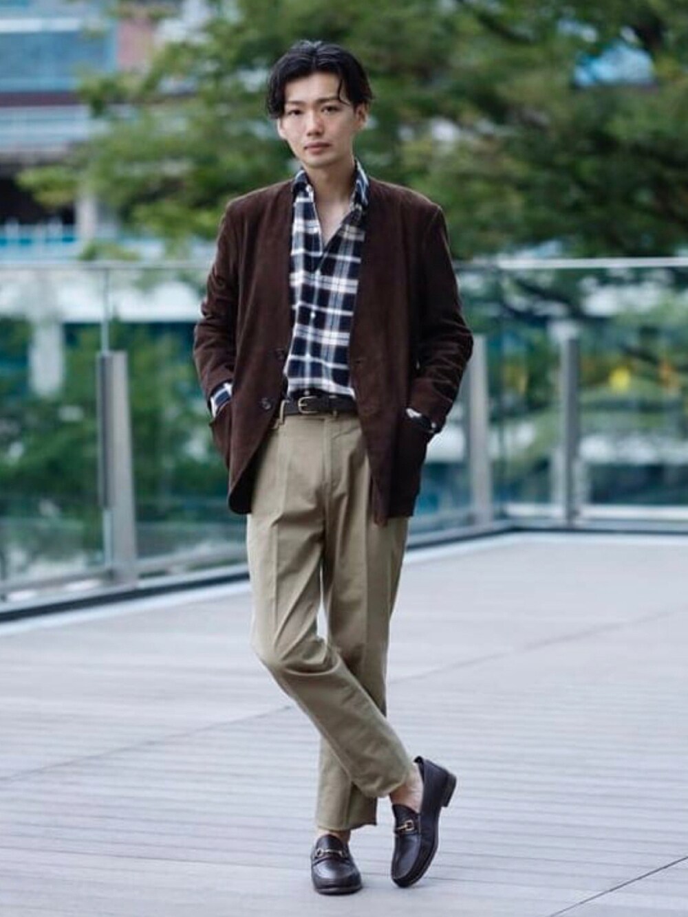 粗野にならないようにテーパードのチノ、綺麗なチェックシャツ、そしてノーカラーのスエードジャケットでモダンな雰囲気を加えてスタイリング。