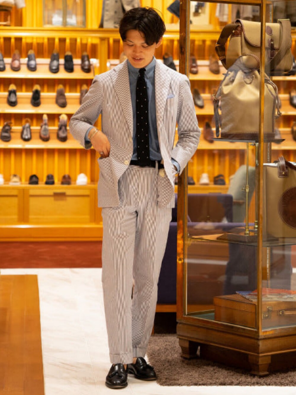 シアサッカースーツスタイル。 ブルーとブラックのアイテムで派手さを軽減。 ビームスF / 伊藤 大貴