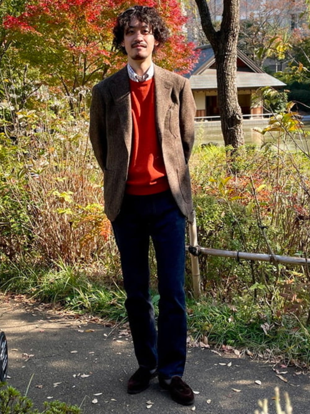 タブカラーシャツのノータイでスタイリング。タッターソールの柄もニットで面積を減らす事で程よいアクセントに。 ビームス ハウス 六本木 / 本寺 拓海