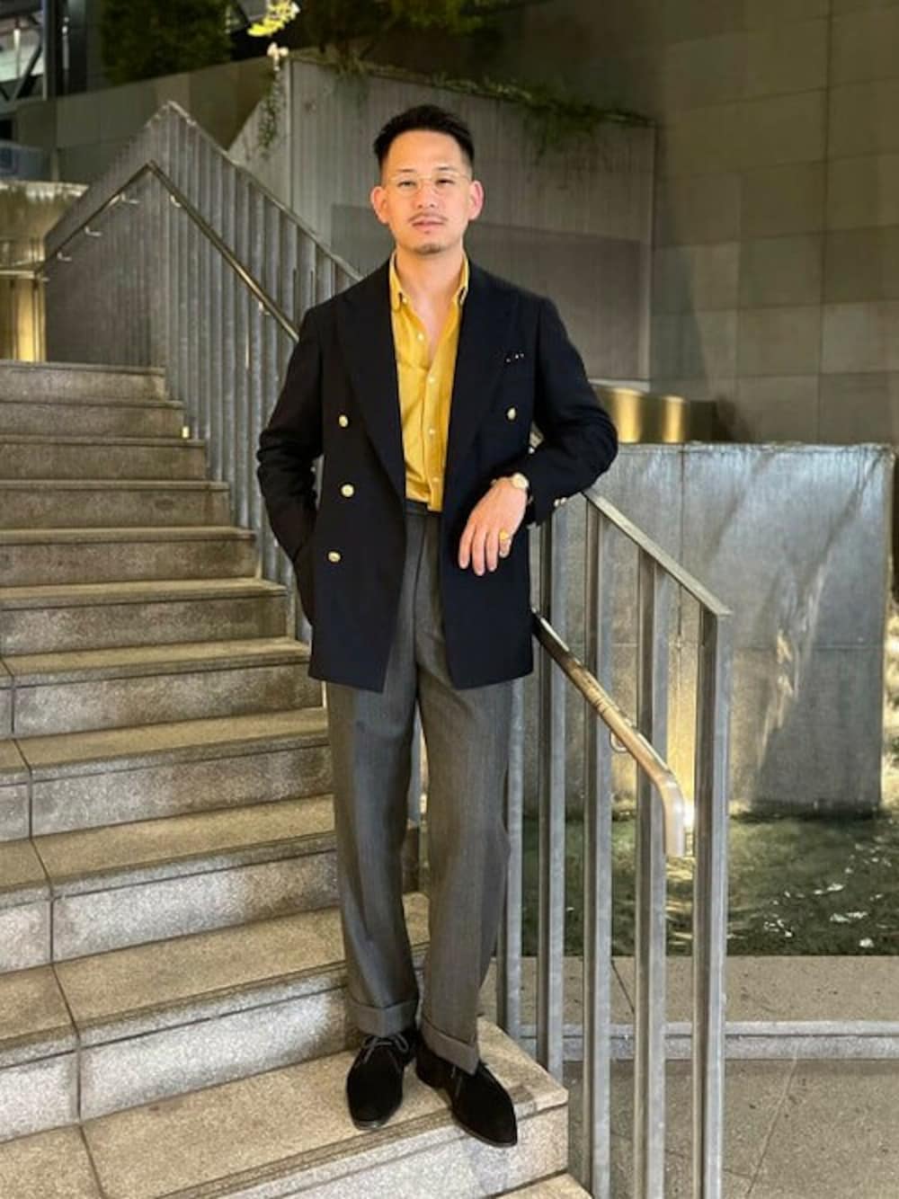 少し濃いマスタード色のコットンリネンシャツと、パープルのソックスの色合わせが気に入ってるスタイリング。 ドットのチーフは白ではなくグレーなので、シックなムードにちょうど良いんです。 ビームス ハウス 梅田 / ビームス ハウス 梅田