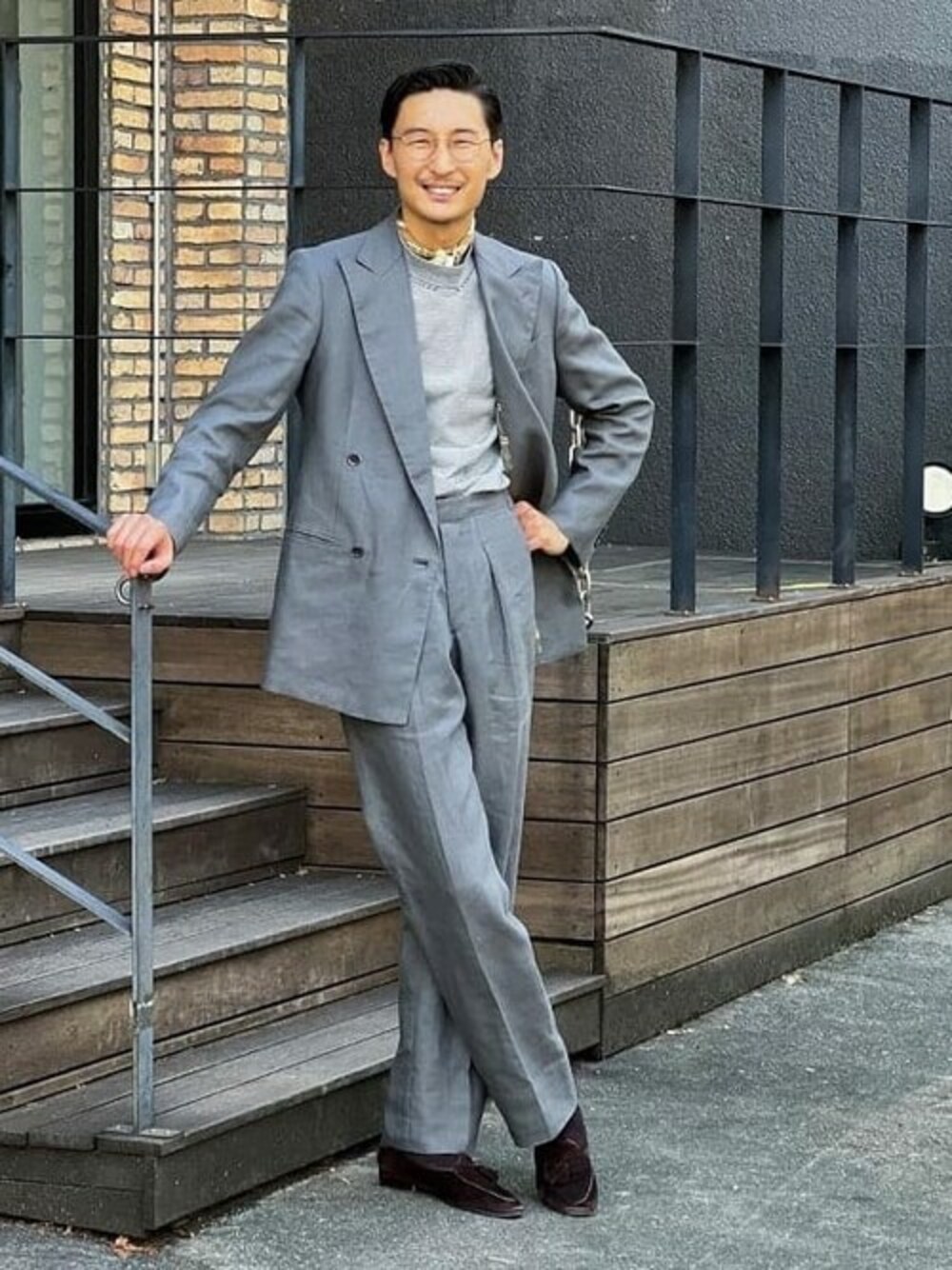 晩夏のリネンスーツスタイル。 細ボーダーTでドレスダウンし、シルクのネッカチーフで少し品良く。 ビームスF・インターナショナルギャラリー ビームス / 阿由葉 銀河