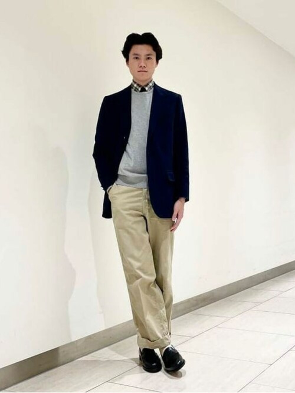【JOHN SMEDLEY】DAVIDを着用したベーシックなブレザースタイル。 全体的にやや野暮ったいスタイルにしたかったので、ブラックのローファーにベージュ系のソックスを合わせました。 ビームス ハウス 名古屋 / 小泉 由幹