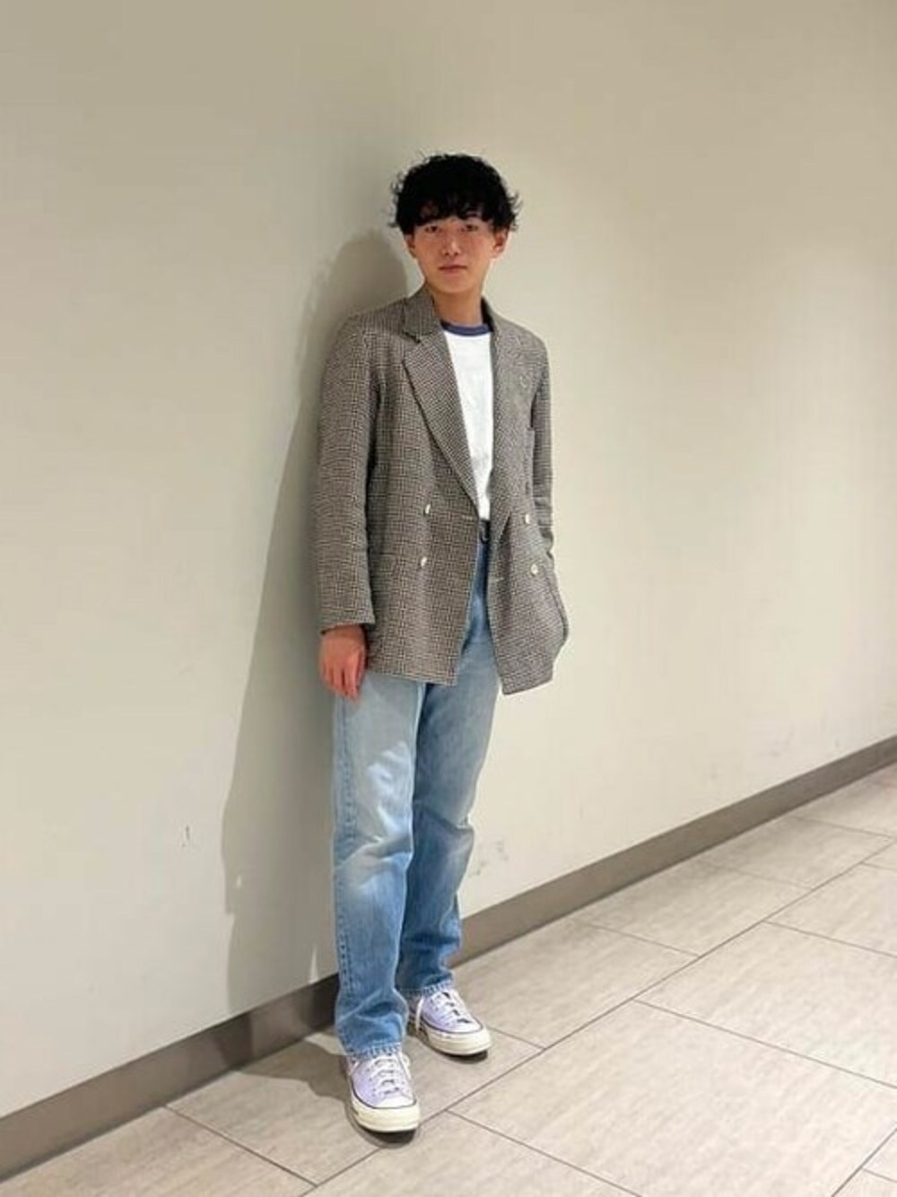 リンガーTシャツ、デニムパンツ、コンバースとアメリカン要素を取り入れたスタイリング。 ハンドトゥースのジャケットをチョイスし、少し外したアメリカンスタイルを意識しました。 ビームス ハウス 名古屋 / 鈴木 朋也
