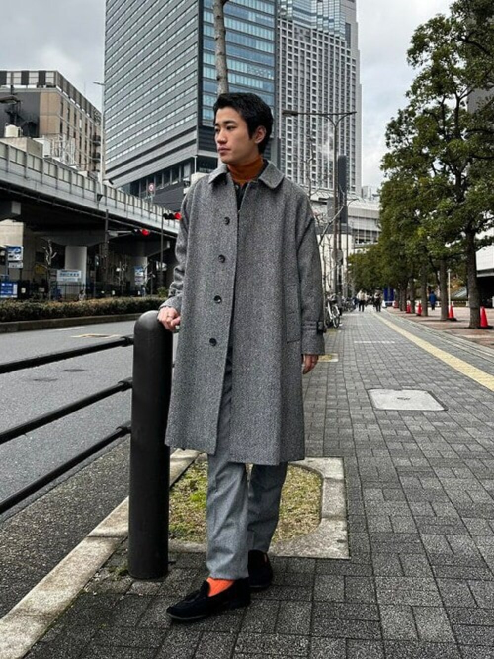 今回は最近ハマっているアレンジを入れてスタイリングを組みました。 まだまだ寒い日が続いているので、タートルネックを着用しデニムジャケットを挟むことで硬すぎない印象にしています。 モノトーンでアウター類を合わせ、靴下とニットでオレンジを入れています。 よろしければご参考に。 ビームス ハウス なんば / 坂根