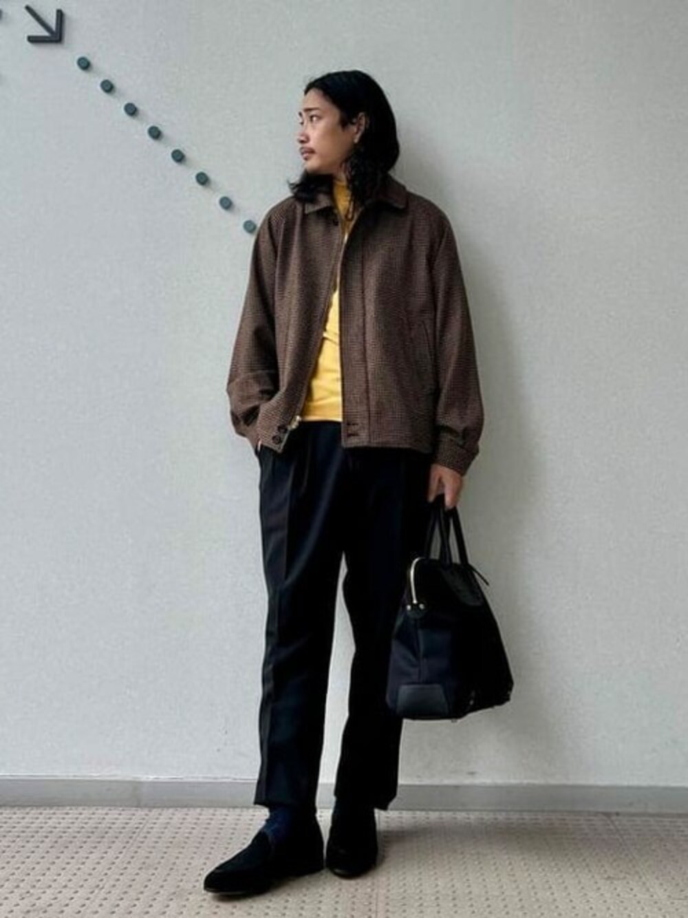 暗めのトーンでスタイリングして【GRAN SASSO】の12ゲージ モックネック ニットを差し色にしてみました。 ブラウンとイエローで秋冬らしいカラーにまとめました。 ビームス 名古屋 / 村松 晴人