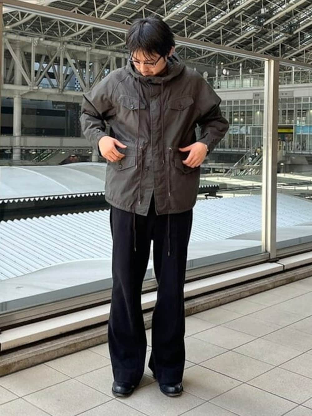 ヴィンテージライクなマウンテンパーカーに、ワイドパンツの合わせです。軽めな素材で、深めの色は、濃いめの色のパンツも薄めの色のパンツも相性抜群! ビームス 梅田 / ヨシダ ユウキ
