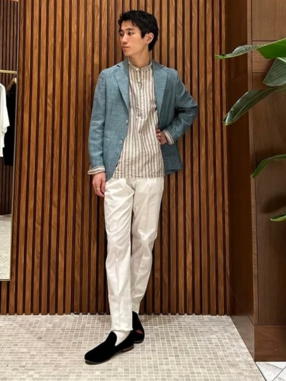 【身長170cm 細身体型】 今回はBARBAの特徴的なカラーリングのジャケットをメインで組んでみました。 清涼感溢れるカラーリングのジャケットに合わせて、他アイテムも同じ明るいトーンで合わせることでまとまりを見せています。 シャツに差し色としてピンクを入れることで特徴的なジャケットのカラーリングを少し緩和させています。 春夏らしい軽快な雰囲気がお勧めです。 よろしければご参考に。