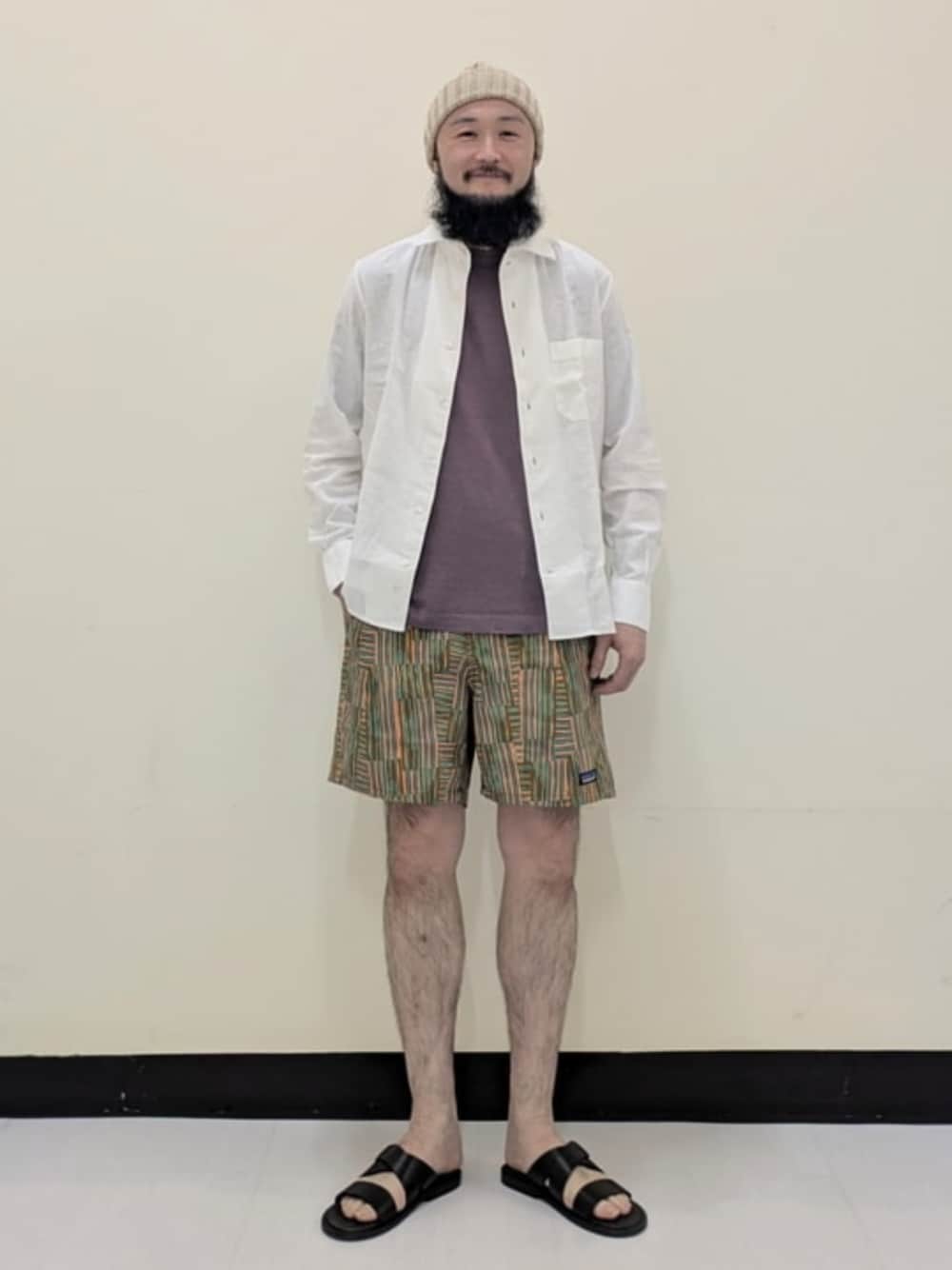 〈178cm・66kg〉少し早いですが、真夏をイメージしてスタイリングしました。リネンのシャツにPatagoniaの柄ショーツを合わせてリゾート感を出しました。 ビームス 姫路 / 小原 亜樹